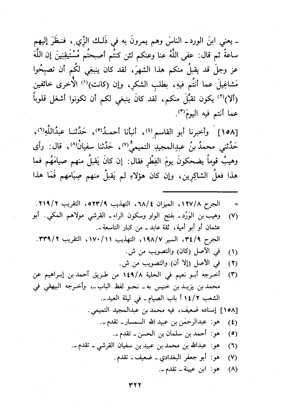 158 - وَأَخْبَرَنَا أَبُو الْقَاسِمِ، أَنْبَأَنَا أَحْمَدُ، حَدَّثَنَا عَبْدُ اللَّهِ، حَدَّثَنِي مُحَمَّدُ بْنُ عَبْدِ الْمَجِيدِ التَّمِيمِيُّ، حَدَّثَنَا سُفْيَانُ، قَالَ: رَأَى وُهَيْبٌ قَوْمًا يَضْحَكُونَ يَوْمَ الْفِطْرِ، فَقَالَ: §إِنْ كَانَ هَؤُلَاءِ يُقْبَلُ مِنْهُمْ صِيَامُهُمْ فَمَا هَذَا فِعْلُ الشَّاكِرِينَ، وَإِنْ كَانَ هَؤُلَاءِ لَمْ يُقْبَلْ مِنْهُمْ صِيَامُهُمْ فَمَا هَذَا -[323]- فِعْلُ الْخَائِفِينَ