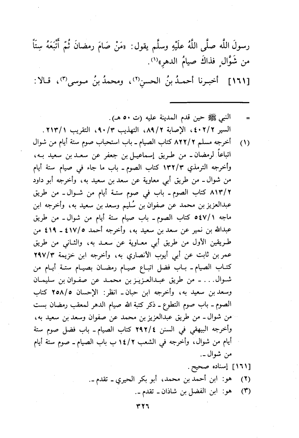 161 - أَخْبَرَنَا أَحْمَدُ بْنُ الْحَسَنِ، وَمُحَمَّدُ بْنُ مُوسَى، قَالَا -[327]-: حَدَّثَنَا أَبُو الْعَبَّاسِ الْأَصَمُّ، حَدَّثَنَا مُحَمَّدُ بْنُ إِسْحَاقَ الصَّغَانِيُّ، حَدَّثَنَا عَبْدُ اللَّهِ بْنُ يُوسُفَ، حَدَّثَنَا يَحْيَى بْنُ حَمْزَةَ، حَدَّثَنِي يَحْيَى بْنُ الْحَارِثِ، أَنَّهُ سَمِعَ أَبَا أَسْمَاءَ الرَّحَبِيَّ، يُحَدِّثُ عَنْ ثَوْبَانَ، مَوْلَى رَسُولِ اللَّهِ صَلَّى اللهُ عَلَيْهِ وَسَلَّمَ أَنَّ رَسُولَ اللَّهِ صَلَّى اللهُ عَلَيْهِ وَسَلَّمَ قَالَ: §«صِيَامُ شَهْرٍ بِعَشَرَةِ أَشْهُرٍ وَسِتَّةِ أَيَّامٍ بَعْدَهُ بِشَهْرَيْنِ فَذَاكَ تَمَامُ السَّنَةِ» يَعْنِي رَمَضَانَ وَسِتَّةَ أَيَّامٍ بَعْدَهُ