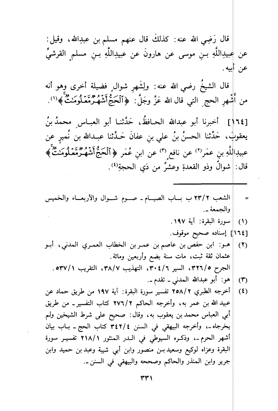 164 - أَخْبَرَنَا أَبُو عَبْدِ اللَّهِ الْحَافِظُ، حَدَّثَنَا أَبُو الْعَبَّاسِ مُحَمَّدُ بْنُ يَعْقُوبَ، حَدَّثَنَا الْحَسَنُ بْنُ عَلِيِّ بْنِ عَفَّانَ، حَدَّثَنَا عَبْدُ اللَّهِ بْنُ نُمَيْرٍ، عَنْ عُبَيْدِ اللَّهِ بْنِ عُمَرَ، عَنْ نَافِعٍ، عَنِ ابْنِ عُمَرَ، {الْحَجُّ أَشْهُرٌ مَعْلُومَاتٌ} [البقرة: 197] قَالَ: §شَوَّالٌ وَذُو الْقِعْدَةِ وَعَشْرٌ مِنْ ذِي الْحَجَّةِ " قَالَ رَضِيَ اللَّهُ عَنْهُ: وَرُوِّينَا عَنْ عُمَرَ بْنِ الْخَطَّابِ، وَعَبْدِ اللَّهِ بْنِ مَسْعُودٍ، وَعَبْدِ اللَّهِ بْنِ عَبَّاسٍ، وَعَبْدِ اللَّهِ بْنِ الزُّبَيْرِ مِثْلَ ذَلِكَ، وَإِنَّمَا أَرَادَ بِالْعَشْرِ مِنْ ذِي الْحِجَّةِ عَنْ لَيَالٍ، فَإِذَا طَلَعَ الْفَجْرُ مِنْ يَوْمِ الْعَاشِرِ فَقَدْ ذَهَبَ وَقْتُ الْإِهْلَالِ بِالْحَجِّ