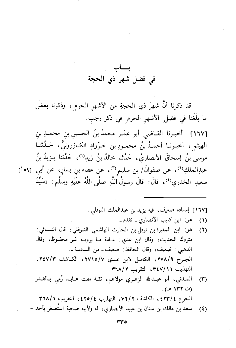 167 - أَخْبَرَنَا الْقَاضِي أَبُو عُمَرَ مُحَمَّدُ بْنُ الْحُسَيْنِ بْنِ مُحَمَّدِ بْنِ الْهَيْثَمِ أَخْبَرَنَا أَحْمَدُ بْنُ مَحْمُودِ بْنِ خُرَّزَاذَ الْكَازَرُونِيُّ، حَدَّثَنَا مُوسَى بْنُ إِسْحَاقَ الْأَنْصَارِيُّ، حَدَّثَنَا خَالِدُ بْنُ زَيْدٍ، حَدَّثَنَا يَزِيدُ بْنُ عَبْدِ الْمَلِكِ، عَنْ صَفْوَانَ بْنِ سُلَيْمٍ، عَنْ عَطَاءِ بْنِ يَسَارٍ، عَنْ أَبِي سَعِيدٍ الْخُدْرِيِّ، قَالَ: قَالَ رَسُولُ اللَّهِ صَلَّى اللهُ عَلَيْهِ وَسَلَّمَ: «§سَيِّدُ -[336]- الشُّهُورِ شَهْرُ رَمَضَانَ، وَأَعْظَمُهَا حُرْمَةً ذُو الْحِجَّةِ»