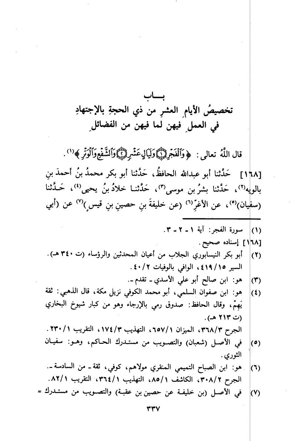 168 - حَدَّثَنَا أَبُو عَبْدِ اللَّهِ الْحَافِظُ، حَدَّثَنَا أَبُو بَكْرٍ مُحَمَّدُ بْنُ أَحْمَدَ بْنِ بَالَوَيْهِ، حَدَّثَنَا بِشْرُ بْنُ مُوسَى، حَدَّثَنَا خَلَّادُ بْنُ يَحْيَى، حَدَّثَنَا سُفْيَانُ، عَنِ الْأَغَرِّ، عَنْ خَلِيفَةَ بْنِ حُصَيْنِ بْنِ قَيْسٍ، عَنْ أَبِي نَصْرٍ، عَنِ ابْنِ عَبَّاسٍ، {§وَالْفَجْرِ} [الفجر: 1] ، قَالَ: فَجْرُ النَّهَارِ، {وَلَيَالٍ عَشْرٍ} [الفجر: 2] قَالَ: عَشْرُ الْأَضْحَى، {هَلْ فِي ذَلِكَ قَسَمٌ لِذِي حِجْرٍ} [الفجر: 5] قَالَ: لِذِي حِجًا