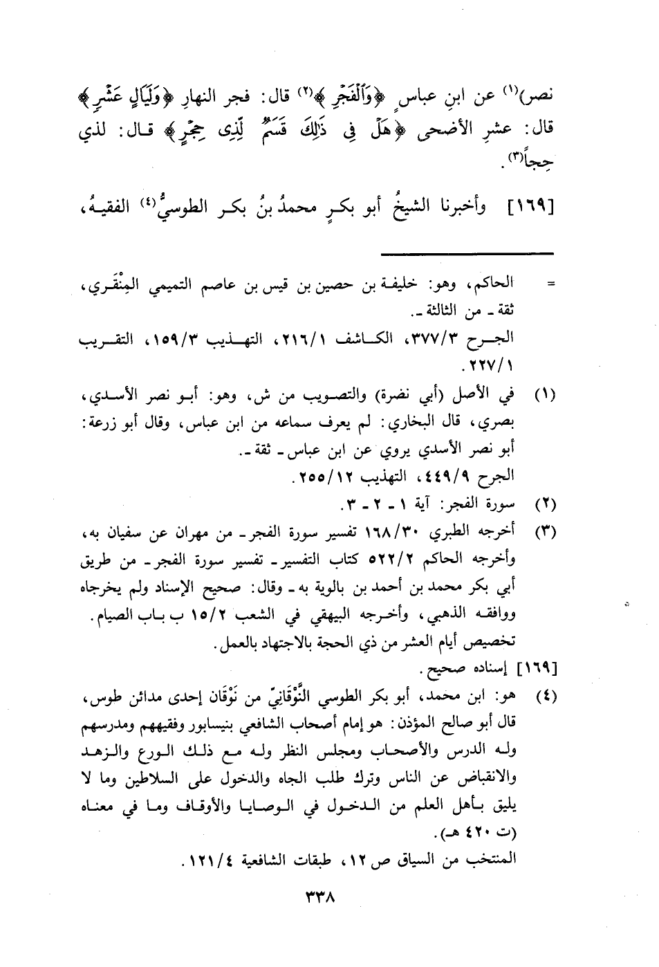 169 - وَأَخْبَرَنَا الشَّيْخُ أَبُو بَكْرٍ مُحَمَّدُ بْنُ بَكْرٍ الطُّوسِيُّ -[339]- الْفَقِيهُ، حَدَّثَنَا أَبُو بِشْرٍ الْحَاضِرِيُّ، حَدَّثَنَا مُحَمَّدُ بْنُ أَحْمَدَ بْنِ زُهَيْرٍ، حَدَّثَنَا عَبْدُ اللَّهِ بْنُ هَاشِمٍ، حَدَّثَنَا يَحْيَى، حَدَّثَنَا عَوْفٌ، حَدَّثَنَا زُرَارَةُ بْنُ أَوْفَى، قَالَ: قَالَ ابْنُ عَبَّاسٍ: §الْعَشْرُ الَّتِي أَقْسَمَ اللَّهُ بِهِنَّ لَيَالِي عَشْرِ ذِي الْحِجَّةِ، وَالشَّفْعُ يَوْمُ الذَّبْحِ، وَالْوَتْرُ يَوْمُ عَرَفَةَ "