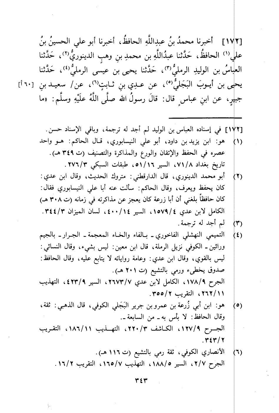 172 - أَخْبَرَنَا مُحَمَّدُ بْنُ عَبْدِ اللَّهِ الْحَافِظُ، أَخْبَرَنَا أَبُو عَلِيٍّ الْحُسَيْنُ بْنُ عَلِيٍّ الْحَافِظُ، حَدَّثَنَا عَبْدُ اللَّهِ بْنُ مُحَمَّدِ بْنِ وَهْبٍ الدَّيْنَوَرِيُّ، حَدَّثَنَا الْعَبَّاسُ بْنُ الْوَلِيدِ الرَّمْلِيُّ، حَدَّثَنَا يَحْيَى بْنُ عِيسَى الرَّمْلِيُّ، حَدَّثَنَا يَحْيَى بْنُ أَيُّوبَ الْبَجَلِيُّ، عَنْ عَدِيِّ بْنِ ثَابِتٍ، عَنْ سَعِيدِ بْنِ جُبَيْرٍ، عَنِ ابْنِ عَبَّاسٍ، قَالَ: قَالَ رَسُولُ اللَّهِ صَلَّى اللهُ عَلَيْهِ وَسَلَّمَ: «§مَا -[344]- مِنْ أَيَّامٍ أَفْضَلُ عِنْدَ اللَّهِ، وَلَا الْعَمَلُ فِيهِنَّ أَحَبُّ إِلَى اللَّهِ عَزَّ وَجَلَّ مِنْ هَذِهِ الْأَيَّامِ الْعَشْرِ، فَأَكْثِرُوا فِيهِنَّ مِنَ التَّهْلِيلِ وَالتَّكْبِيرِ، فَإِنَّهَا أَيَّامُ التَّهْلِيلِ وَالتَّكْبِيرِ وَذِكْرِ اللَّهِ، وَإِنَّ صِيَامَ يَوْمٍ مِنْهَا يَعْدِلُ صِيَامَ سَنَةٍ، وَالْعَمَلُ فِيهِنَّ يُضَاعَفُ سِتَّ مِائَةِ ضِعْفٍ»