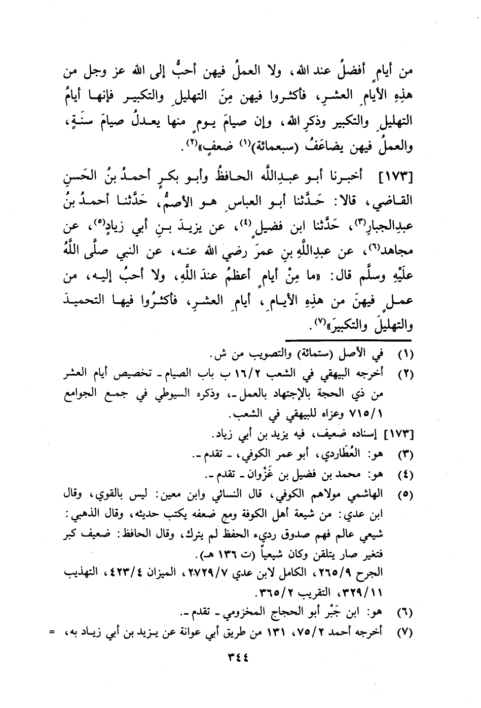 أَخْبَرَنَا أَبُو عَبْدِ اللَّهِ الْحَافِظُ، وَأَبُو بَكْرٍأَحْمَدُ بْنُ الْحَسَنِ الْقَاضِي قَالَا: حَدَّثَنَا أَبُو الْعَبَّاسِ هُوَ الْأَصَمُّ، حَدَّثَنَا أَحْمَدُ بْنُ عَبْدِ الْجَبَّارِ، حَدَّثَنَا ابْنُ فُضَيْلٍ، عَنْ يَزِيدَ بْنِ أَبِي زِيَادٍ، عَنْ مُجَاهِدٍ، عَنْ عَبْدِ اللَّهِ بْنِ عُمَرَ، رَضِيَ اللَّهُ عَنْهُ، عَنِ النَّبِيِّ صَلَّى اللهُ عَلَيْهِ وَسَلَّمَ قَالَ: §«مَا مِنْ أَيَّامٍ أَعْظَمُ عِنْدَ اللَّهِ وَلَا أَحَبُّ إِلَيْهِ مِنْ عَمَلٍ فِيهِنَّ مِنْ هَذِهِ الْأَيَّامِ أَيَّامِ الْعَشْرِ فَأَكْثِرُوا فِيهَا مِنَ التَّحْمِيدِ وَالتَّهْلِيلِ وَالتَّكْبِيرِ» قَالَ رَضِيَ اللَّهُ عَنْهُ: وَرَوَاهُ عَلِيُّ بْنُ عَاصِمٍ، عَنْ يَزِيدَ فَزَادَ فِيهِ «وَالتَّسْبِيحِ» غَيْرَ أَنَّهُ قَالَ: عَنِ ابْنِ عَبَّاسٍ بَدَلَ ابْنِ عُمَرَ