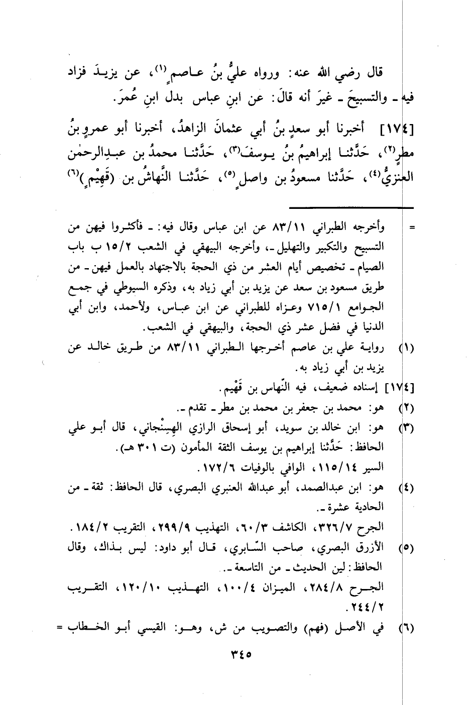 174 - أَخْبَرَنَا أَبُو سَعْدِ بْنُ أَبِي عُثْمَانَ الزَّاهِدُ، أَنْبَأَنَا أَبُو عَمْرِو بْنُ مَطَرٍ، حَدَّثَنَا إِبْرَاهِيمُ بْنُ يُوسُفَ، حَدَّثَنَا مُحَمَّدُ بْنُ عَبْدِ الرَّحْمَنِ الْعَنَزِيُّ، حَدَّثَنَا مَسْعُودُ بْنُ وَاصِلٍ، حَدَّثَنَا النَّهَّاشُ بْنُ فَهْدٍ، عَنْ قَتَادَةَ، عَنْ سَعِيدِ بْنِ الْمُسَيِّبِ، عَنْ أَبِي هُرَيْرَةَ، قَالَ: قَالَ رَسُولُ اللَّهِ صَلَّى اللهُ عَلَيْهِ وَسَلَّمَ: §«مَا مِنْ أَيَّامٍ مِنْ أَيَّامِ الدُّنْيَا الْعَمَلُ فِيهَا أَحَبُّ إِلَى اللَّهِ تَعَالَى أَنْ يُتَعَبَّدَ لَهُ فِيهَا مِنْ أَيَّامِ الْعَشْرِ يَعْدِلُ صِيَامُ كُلِّ يَوْمٍ مِنْهَا بِصِيَامِ سَنَةٍ، وَقِيَامُ كُلِّ لَيْلَةٍ بِقِيَامِ لَيْلَةِ الْقَدْرِ»