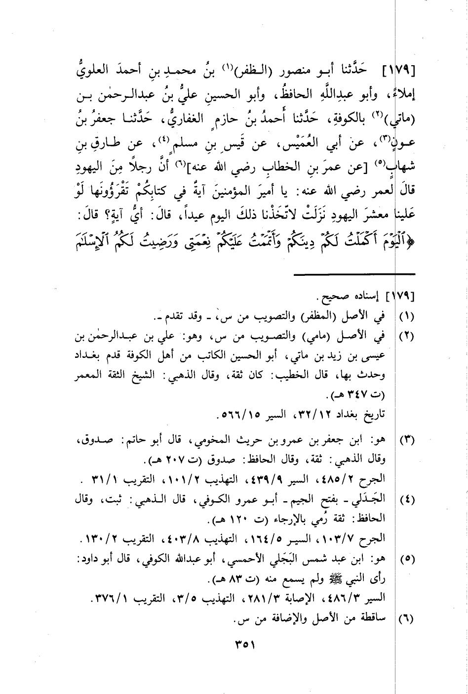179 - حَدَّثَنَا أَبُو مَنْصُورٍ الظَّفَرُ بْنُ مُحَمَّدِ بْنِ أَحْمَدَ الْعَلَوِيُّ إِمْلَاءً، وَأَبُو عَبْدِ اللَّهِ الْحَافِظُ، وَأَبُو الْحُسَيْنِ عَلِيُّ بْنُ عَبْدِ الرَّحْمَنِ بْنِ مَاتِي بِالْكُوفَةِ، حَدَّثَنَا أَحْمَدُ بْنُ حَازِمٍ الْغِفَارِيُّ، حَدَّثَنَا جَعْفَرُ بْنُ عَوْنٍ، عَنْ أَبِي الْعُمَيْسِ، عَنْ قَيْسِ بْنِ مُسْلِمٍ، عَنْ طَارِقِ بْنِ شِهَابٍ، عَنْ عُمَرَ بْنِ الْخَطَّابِ، رَضِيَ اللَّهُ عَنْهُ أَنَّ رَجُلًا مِنَ الْيَهُودِ قَالَ لِعُمَرَ رَضِيَ اللَّهُ عَنْهُ: يَا أَمِيرَ الْمُؤْمِنِينَ، آيَةٌ فِي كِتَابِكُمْ تَقْرَءُونَهَا لَوْ عَلَيْنَا مَعْشَرَ الْيَهُودِ نَزَلَتْ لَاتَّخَذْنَا ذَلِكَ الْيَوْمَ عِيدًا قَالَ: أَيُّ آيَةٍ؟ قَالَ: {§الْيَوْمَ أَكْمَلْتُ لَكُمْ دِينَكُمْ وَأَتْمَمْتُ عَلَيْكُمْ نِعْمَتِي وَرَضِيتُ لَكُمُ الْإِسْلَامَ -[352]- دِينًا} [المائدة: 3] فَقَالَ عُمَرُ: قَدْ عَرَفْنَا ذَلِكَ الْيَوْمَ وَالْمَكَانَ الَّذِي أُنْزِلَتْ فِيهِ نَزَلَتْ عَلَى رَسُولِ اللَّهِ صَلَّى اللهُ عَلَيْهِ وَسَلَّمَ بِعَرَفَاتٍ يَوْمَ جُمُعَةٍ