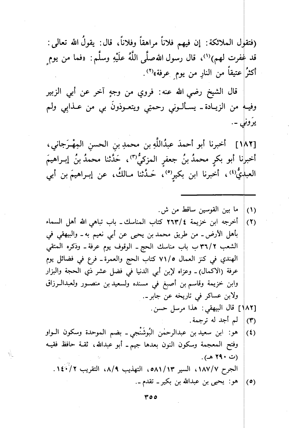 182 - أَخْبَرَنَا أَبُو أَحْمَدَ عَبْدُ اللَّهِ بْنُ مُحَمَّدِ بْنِ الْحَسَنِ الْمِهْرَجَانِيُّ، أَنْبَأَنَا أَبُو بَكْرٍ مُحَمَّدُ بْنُ جَعْفَرٍ الْمُزَكِّي، حَدَّثَنَا مُحَمَّدُ بْنُ إِبْرَاهِيمَ الْعَبْدِيُّ، أَنْبَأَنَا ابْنُ بُكَيْرٍ، حَدَّثَنَا مَالِكٌ، عَنْ إِبْرَاهِيمَ بْنِ أَبِي عَبْلَةَ، عَنْ طَلْحَةَ بْنِ عُبَيْدِ اللَّهِ، أَنَّ رَسُولَ اللَّهِ صَلَّى اللهُ عَلَيْهِ وَسَلَّمَ قَالَ: §«مَا رُئِيَ الشَّيْطَانُ يَوْمًا هُوَ فِيهِ أَصْغَرُ وَلَا أَدْحَرُ وَلَا أَحْقَرُ وَلَا أَغْيَظُ مِنْهُ مِنْ يَوْمِ عَرَفَةَ، وَمَا ذَاكَ إِلَّا مِمَّا يَرَى مِنْ تَنْزِيلِ الرَّحْمَةِ وَتَجَاوُزِ اللَّهِ عَنِ الذُّنُوبِ إِلَّا مَا رُئِيَ يَوْمَ بَدْرٍ» هَذَا مُرْسَلٌ حَسَنٌ، وَرُوِيَ مِنْ وَجْهٍ آخَرَ ضَعِيفٍ عَنْ طَلْحَةَ، عَنْ أَبِي الدَّرْدَاءِ، عَنِ النَّبِيِّ صَلَّى اللهُ عَلَيْهِ وَسَلَّمَ