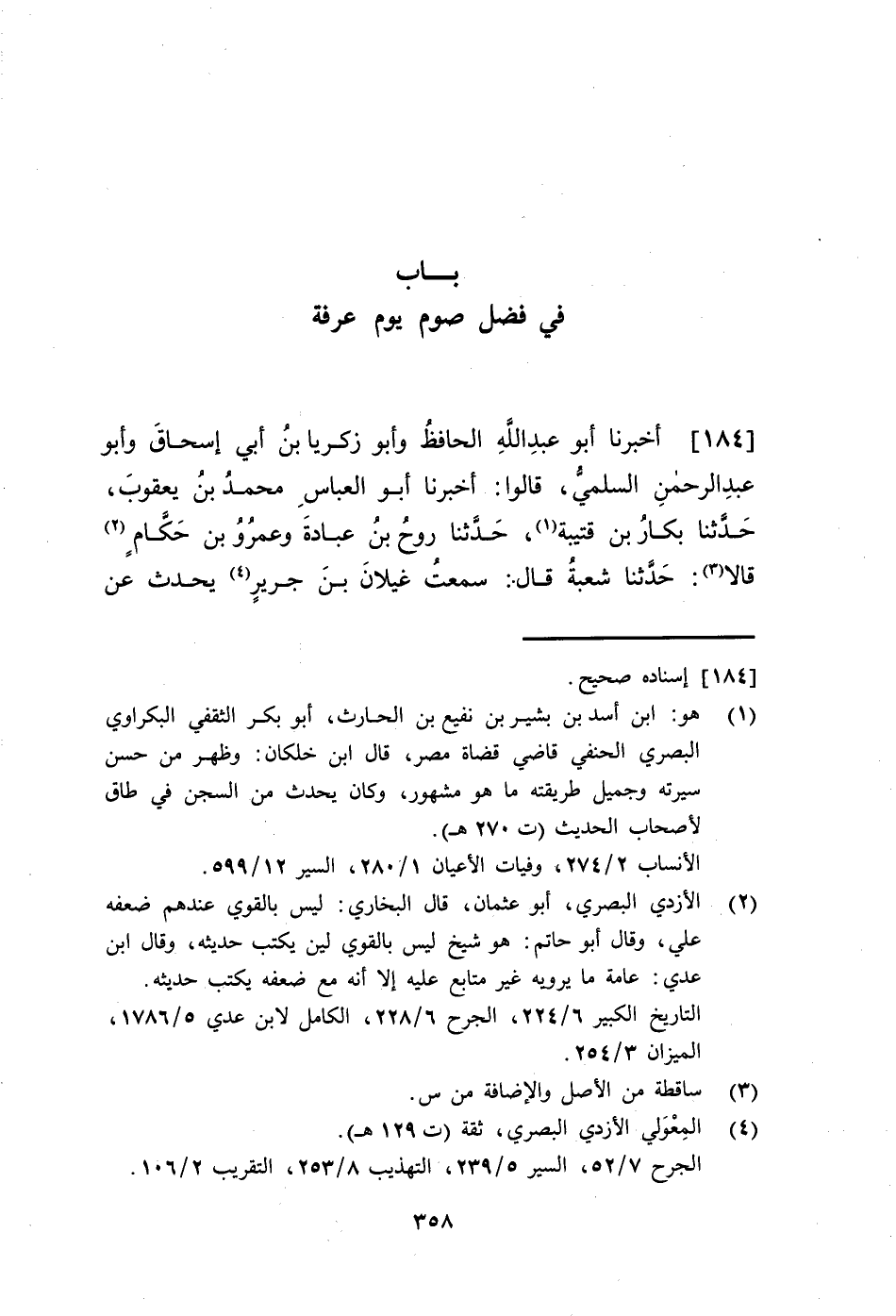 184 - أَخْبَرَنَا أَبُو عَبْدِ اللَّهِ الْحَافِظُ، وَأَبُو زَكَرِيَّا بْنُ أَبِي إِسْحَاقَ وَأَبُو عَبْدِ الرَّحْمَنِ السُّلَمِيُّ قَالُوا: أَنْبَأَنَا أَبُو الْعَبَّاسِ مُحَمَّدُ بْنُ يَعْقُوبَ، حَدَّثَنَا بَكَّارُ بْنُ قُتَيْبَةَ، حَدَّثَنَا رَوْحُ بْنُ عُبَادَةَ، وَعَمْرُو بْنُ حَكَّامٍ، قَالَا: حَدَّثَنَا شُعْبَةُ، قَالَ: سَمِعْتُ غَيْلَانَ بْنَ جَرِيرٍ، يُحَدِّثُ عَنْ عَبْدِ اللَّهِ بْنِ مَعْبَدٍ الزِّمَّانِيِّ، عَنْ أَبِي قَتَادَةَ الْأَنْصَارِيِّ، أَنَّ رَسُولَ اللَّهِ صَلَّى اللهُ عَلَيْهِ وَسَلَّمَ سُئِلَ عَنْ صَوْمِ يَوْمِ عَرَفَةَ فَقَالَ: §«يُكَفِّرُ السَّنَةَ الْمَاضِيَةَ وَالسَّنَةَ الْقَابِلَةَ»