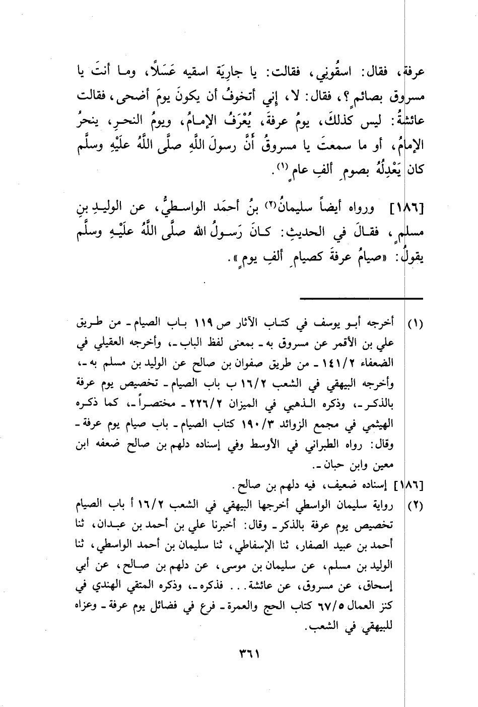 186 - وَرَوَاهُ أَيْضًا سُلَيْمَانُ بْنُ أَحْمَدَ الْوَاسِطِيُّ , عَنِ الْوَلِيدِ بْنِ مُسْلِمٍ، فَقَالَ فِي الْحَدِيثِ: كَانَ رَسُولُ اللَّهِ صَلَّى اللهُ عَلَيْهِ وَسَلَّمَ يَقُولُ: §«صِيَامُ عَرَفَةَ كَصِيَامِ أَلْفِ يَوْمٍ»