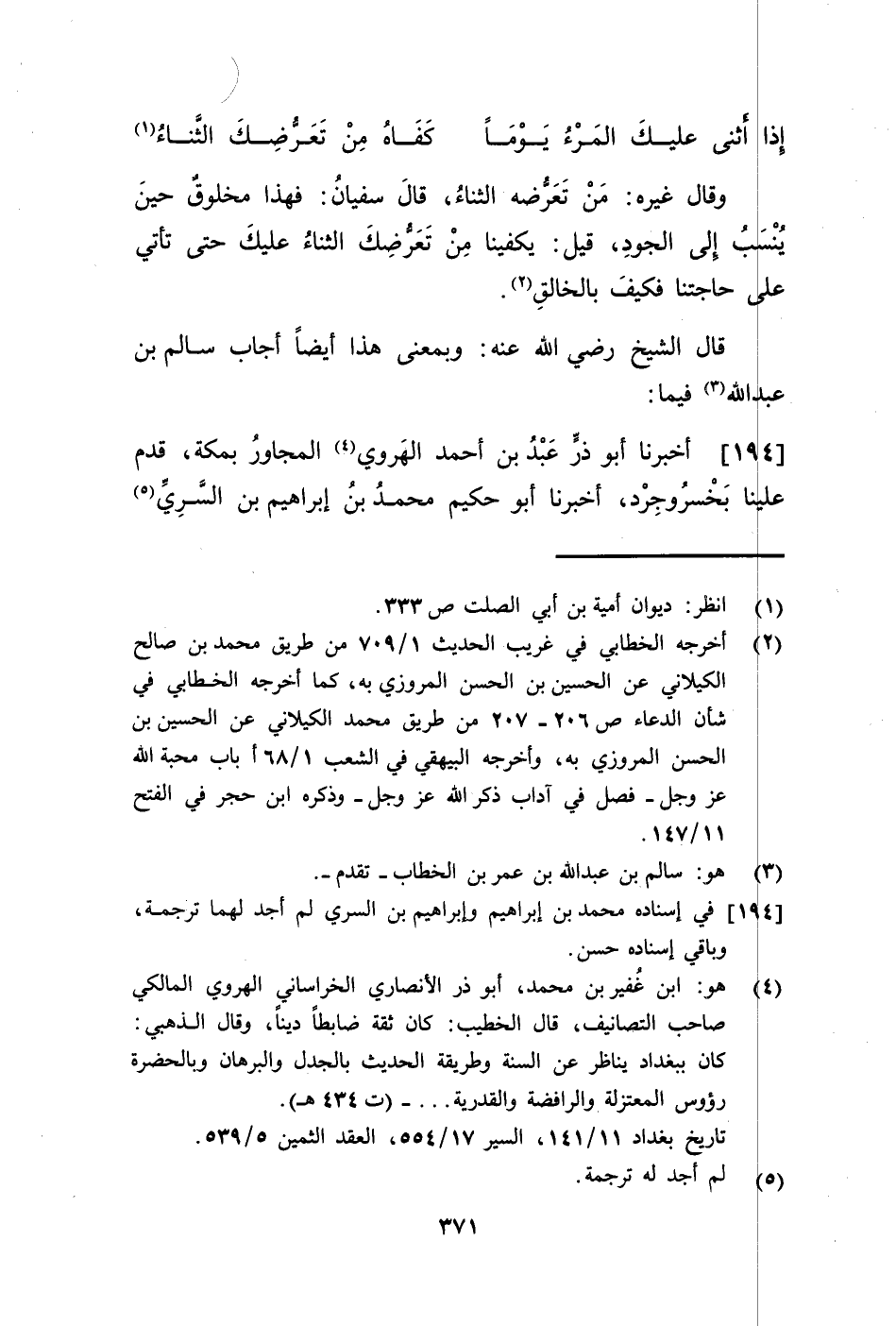 194 - أَخْبَرَنَا أَبُو ذَرٍّ عَبْدُ بْنُ أَحْمَدَ الْهَرَوِيُّ الْمُجَاوِرُ، بِمَكَّةَ، قَدِمَ عَلَيْنَا بِخُسْرَوْجِرْدَ، أَنْبَأَنَا أَبُو حَكِيمٍ مُحَمَّدُ بْنُ إِبْرَاهِيمَ بْنِ السَّرِيِّ -[372]- بْنِ يَحْيَى التَّمِيمِيُّ بِالْكُوفَةِ، حَدَّثَنِي أَبِي أَبُو الْقَاسِمِ بْنُ السَّرِيِّ، حَدَّثَنَا أَبِي أَبُو عُبَيْدَةَ السَّرِيُّ بْنُ يَحْيَى التَّمِيمِيُّ، حَدَّثَنَا عُثْمَانُ بْنُ زُفَرَ، حَدَّثَنَا صَفْوَانُ بْنُ أَبِي الصَّهْبَاءِ عَنْ بُكَيْرِ بْنِ عَتِيقٍ قَالَ: حَجَجْتُ فَتَوَسَّمْتُ رَجُلًا أَقْتَدِي بِهِ فَإِذَا رَجُلٌ مُصَفِّرُ لِحْيَتِهِ، وَإِذَا هُوَ سَالِمُ بْنُ عَبْدِ اللَّهِ فَإِذَا هُوَ فِي الْمَوْقِفِ يَقُولُ: لَا إِلَهَ إِلَّا اللَّهُ وَحْدَهُ لَا شَرِيكَ لَهُ، لَهُ الْمُلْكُ وَلَهُ الْحَمْدُ بِيَدِهِ الْخَيْرُ وَهُوَ عَلَى كُلِّ شَيْءٍ قَدِيرٌ، لَا إِلَهَ إِلَّا اللَّهُ إِلَهًا وَاحِدًا وَنَحْنُ لَهُ مُسْلِمُونَ، لَا إِلَهَ إِلَّا اللَّهُ وَلَوْ كَرِهَ الْمُشْرِكُونَ، لَا إِلَهٍ إِلَّا اللَّهُ رَبُّنَا وَرَبُّ آبَائِنَا الْأَوَّلِينَ، قَالَ: فَلَمْ يَزَلْ يَقُولُ هَذَا حَتَّى غَابَتِ الشَّمْسُ ثُمَّ نَظَرَ إِلَيَّ -[373]- فَقَالَ: قَدْ رَأَيْتُ لَوَذَانَكَ بِي الْيَوْمَ، ثُمَّ قَالَ: حَدَّثَنِي أَبِي عَنْ أَبِيهِ عُمَرَ بْنِ الْخَطَّابِ، عَنِ النَّبِيِّ صَلَّى اللهُ عَلَيْهِ وَسَلَّمَ قَالَ: " يَقُولُ اللَّهُ تَبَارَكَ وَتَعَالَى: مَنْ §شَغَلَهُ ذِكْرِي عَنْ مَسْأَلَتِي أَعْطَيْتُهُ أَفْضَلَ مَا أُعْطِي السَّائِلِينَ " قَالَ الشَّيْخُ الْإِمَامُ أَحْمَدُ الْبَيْهَقِيُّ رَضِيَ اللَّهُ عَنْهُ: وَقَدْ رُوِيَ فِي حَدِيثٍ آخَرَ لَيْسَ بِالْقَوِيِّ مَا