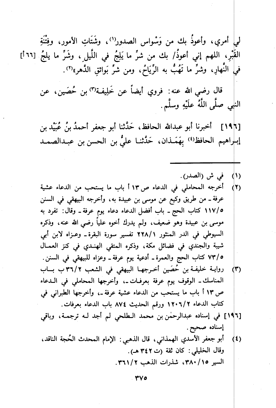 196 - أَخْبَرَنَا أَبُو عَبْدِ اللَّهِ الْحَافِظُ، حَدَّثَنَا أَبُو جَعْفَرٍ أَحْمَدُ بْنُ عُبَيْدِ بْنِ إِبْرَاهِيمَ الْحَافِظُ بِهَمَذَانَ، حَدَّثَنَا عَلِيُّ بْنُ الْحَسَنِ بْنِ عَبْدِ الصَّمَدِ -[376]- الطَّيَالِسِيُّ عَلَّانُ الْحَافِظُ حَدَّثَنَا أَبُو إِبْرَاهِيمَ التَّرْجُمَانِيُّ، حَدَّثَنَا عَبْدُ الرَّحْمَنِ بْنُ مُحَمَّدِ الطَّلْحِيُّ، حَدَّثَنَا عَبْدُ الرَّحْمَنِ بْنُ مُحَمَّدٍ الْمُحَارِبِيُّ، عَنْ مُحَمَّدِ بْنِ سُوقَةَ، عَنْ مُحَمَّدِ بْنِ الْمُنْكَدِرِ، عَنْ جَابِرِ بْنِ عَبْدِ اللَّهِ، قَالَ: قَالَ رَسُولُ اللَّهِ صَلَّى اللهُ عَلَيْهِ وَسَلَّمَ: " §مَا مِنْ مُسْلِمٍ يَقِفُ عَشِيَّةَ عَرَفَةَ بِالْمَوْقِفِ، فَيَسْتَقْبِلُ الْقِبْلَةَ بِوَجْهِهِ، ثُمَّ يَقُولُ: لَا إِلَهَ إِلَّا اللَّهُ وَحْدَهُ لَا شَرِيكَ لَهُ، لَهُ الْمُلْكُ وَلَهُ الْحَمْدُ، وَهُوَ عَلَى كُلِّ شَيْءٍ قَدِيرٌ مِائَةَ مَرَّةٍ ثُمَّ يَقْرَأَ قُلْ هُوَ اللَّهُ أَحَدٌ مِائَةَ مَرَّةٍ ثُمَّ يَقُولُ: اللَّهُمَّ صَلِّ عَلَى مُحَمَّدٍ وَعَلَى آلِ مُحَمَّدٍ كَمَا صَلَّيْتَ عَلَى إِبْرَاهِيمَ، وَآلِ إِبْرَاهِيمَ، إِنَّكَ حَمِيدٌ مَجِيدٌ، وَعَلَيْنَا مَعَهُمْ مِائَةَ مَرَّةٍ إِلَّا قَالَ اللَّهُ تَبَارَكَ وَتَعَالَى: يَا مَلَائِكَتِي مَا جَزَاءُ عَبْدِي هَذَا سَبَّحَنِي وَهَلَّلَنِي وَكَبَّرَنِي وَعَظَّمَنِي وَعَرَّفَنِي، وَأَثْنَى عَلَيَّ، وَصَلَّى عَلَى نَبِيِّي -[377]-، اشْهَدُوا مَلَائِكَتِي أَنِّي قَدْ غَفَرْتُ لَهُ وَشَفَّعْتُهُ فِي نَفْسِهِ، وَلَوْ سَأَلَنِي عَبْدِي هَذَا لَشَفَّعْتُهُ فِي أَهْلِ الْمَوْقِفِ كُلِّهِمْ " قَالَ: كَذَلِكَ قَالَ شَيْخُنَا عَبْدُ الرَّحْمَنِ بْنُ مُحَمَّدٍ الطَّلْحِيُّ، وَالصَّوَابُ عَبْدُ اللَّهِ