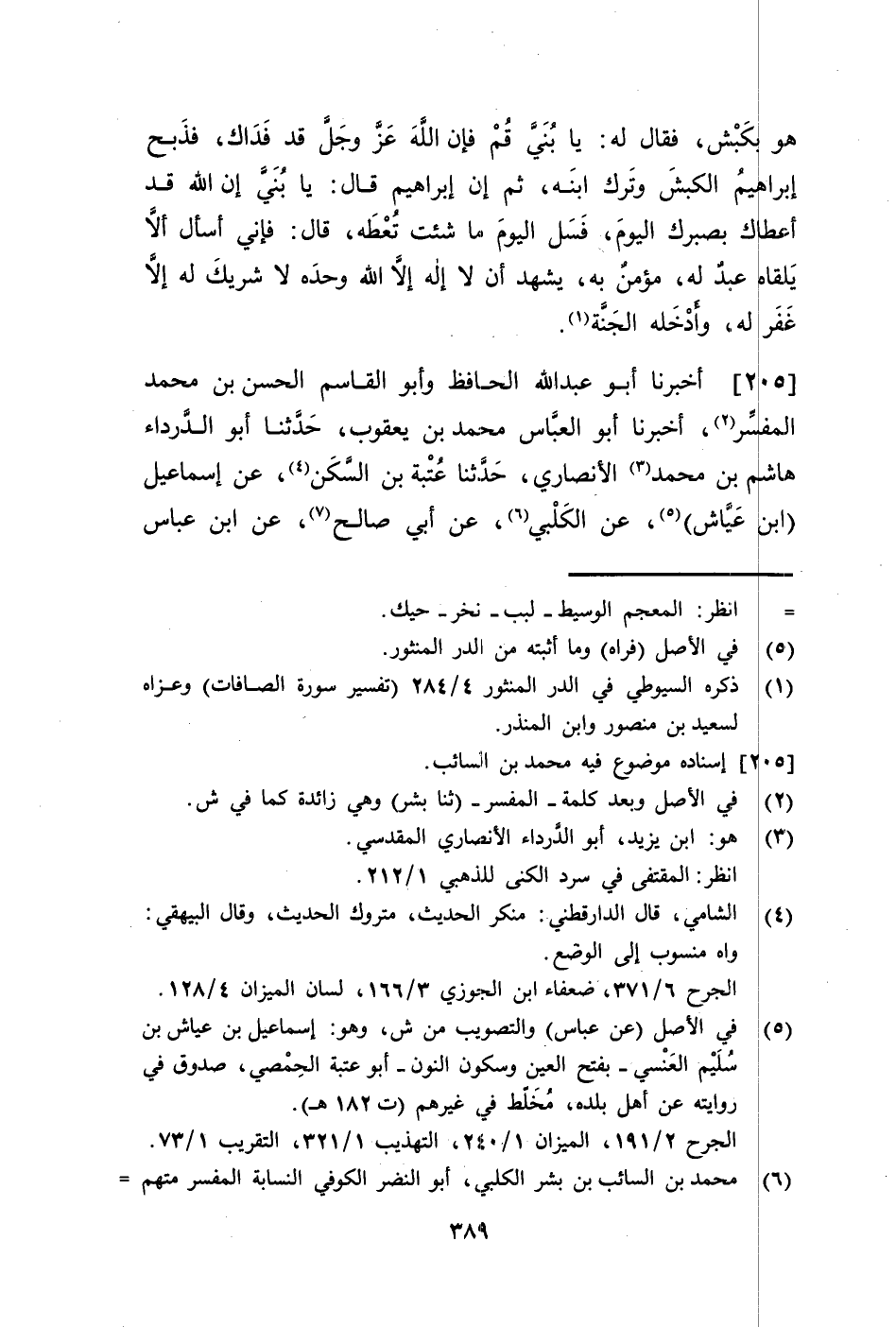 205 - أَخْبَرَنَا أَبُو عَبْدِ اللَّهِ الْحَافِظُ، وَأَبُو الْقَاسِمِ الْحَسَنُ بْنُ مُحَمَّدٍ الْمُفَسِّرُ، حَدَّثَنَا بشر أَنْبَأَنَا أَبُو الْعَبَّاسِ مُحَمَّدُ بْنُ يَعْقُوبَ، حَدَّثَنَا أَبُو الدَّرْدَاءِ هَاشِمُ بْنُ مُحَمَّدٍ الْأَنْصَارِيُّ، حَدَّثَنَا عُتْبَةُ بْنُ السَّكَنِ، عَنْ إِسْمَاعِيلَ بْنِ عَيَّاشٍ، عَنِ الْكَلْبِيِّ، عَنْ أَبِي صَالِحٍ، عَنِ ابْنِ عَبَّاسٍ، قَالَ: §إِنَّمَا سُمِّيَتْ تَرْوِيَةً وَعَرَفَةَ؛ لِأَنَّ إِبْرَاهِيمَ عَلَيْهِ السَّلَامُ أَتَاهُ الْوَحْيُ فِي مَنَامِهِ أَنْ يَذْبَحَ ابْنَهُ، فَرُئِيَ فِي نَفْسِهِ أَمِنَ اللَّهِ هَذَا أَمْ مِنَ الشَّيْطَانِ؟ وَأَصْبَحَ صَائِمًا فَلَمَّا كَانَ لَيْلَةَ عَرَفَةَ أَتَاهُ الْوَحْيُ فَعَرَفَ أَنَّهُ الْحَقُّ مِنْ رَبِّهِ فَسُمِّيَتْ عَرَفَةَ كَذَا قَالَ فِي هَذِهِ الرِّوَايَةِ
