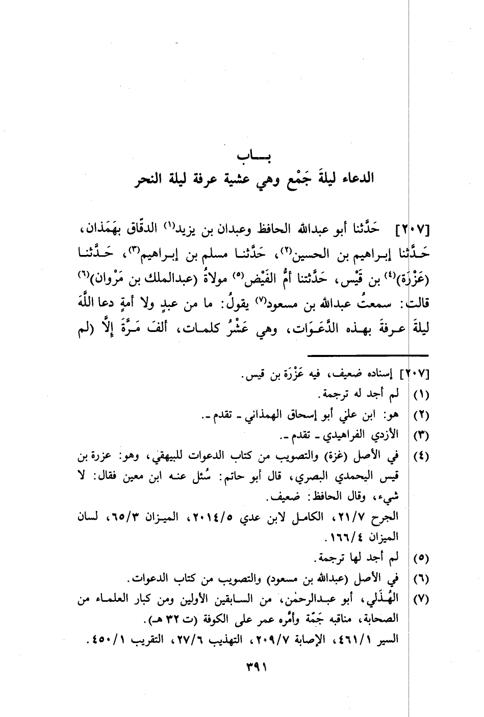 207 - حَدَّثَنَا أَبُو عَبْدِ اللَّهِ الْحَافِظُ، وَعَبْدَانُ بْنُ يَزِيدَ الدَّقَّاقُ بِهَمَذَانَ حَدَّثَنَا إِبْرَاهِيمُ بْنُ الْحُسَيْنِ، حَدَّثَنَا مُسْلِمُ بْنُ إِبْرَاهِيمَ، حَدَّثَنَا عَزْرَةُ بْنُ قَيْسٍ، حَدَّثَتْنَا أُمُّ الْفَيْضِ، مَوْلَاةُ عَبْدِ اللَّهِ بْنِ مَسْعُودٍ، قَالَتْ: سَمِعْتُ عَبْدَ اللَّهِ بْنَ مَسْعُودٍ، يَقُولُ: §مَا مِنْ عَبْدٍ وَلَا أَمَةٍ دَعَا اللَّهَ لَيْلَةَ عَرَفَةَ بِهَذِهِ الدَّعَوَاتِ، وَهِيَ عَشْرُ كَلِمَاتٍ أَلْفَ مَرَّةٍ إِلَّا لَمْ -[392]- يَسْأَلِ اللَّهَ شَيْئًا إِلَّا أَعْطَاهُ إِيَّاهُ إِلَّا قَطِيعَةَ رَحِمٍ أَوْ مَأْثَمًا: سُبْحَانَ الَّذِي فِي السَّمَاءِ عَرْشُهُ، سُبْحَانَ الَّذِي فِي الْأَرْضِ مَوْطِئُهُ، سُبْحَانَ الَّذِي فِي الْبَحْرِ سَبِيلُهُ، سُبْحَانَ الَّذِي فِي النَّارِ سُلْطَانُهُ، سُبْحَانَ الَّذِي فِي الْجَنَّةِ رَحْمَتُهُ، سُبْحَانَ الَّذِي فِي الْقُبُورِ قَضَاؤُهُ، سُبْحَانَ الَّذِي فِي الْهَوَاءِ رَوْحُهُ، سُبْحَانَ الَّذِي رَفَعَ السَّمَاءَ، سُبْحَانَ الَّذِي وَضَعَ الْأَرَضِينَ، سُبْحَانَ الَّذِي لَا مَلْجَأَ وَلَا مَنْجَى مِنْهُ إِلَّا إِلَيْهِ، قَالَتْ أُمُّ الْفَيْضِ: فَقُلْتُ لِعَبْدِ اللَّهِ بْنِ مَسْعُودٍ: أَنْتَ سَمِعْتَ هَذَا مِنْ رَسُولِ اللَّهِ صَلَّى اللهُ عَلَيْهِ وَسَلَّمَ؟ قَالَ: نَعَمْ وَرَوَاهُ عَاصِمُ بْنُ عَلِيٍّ عَنْ عَزْرَةَ بْنِ قَيْسٍ، بِإِسْنَادِهِ، وَزَادَ قَالَ: تَكُونُ عَلَى وُضُوءٍ، فَإِذَا فَرَغْتَ مِنْ آخِرِهِ صَلَّيْتَ عَلَى النَّبِيِّ صَلَّى اللهُ عَلَيْهِ وَسَلَّمَ وَاسْتَأْنَفْتَ حَاجَتَكَ "