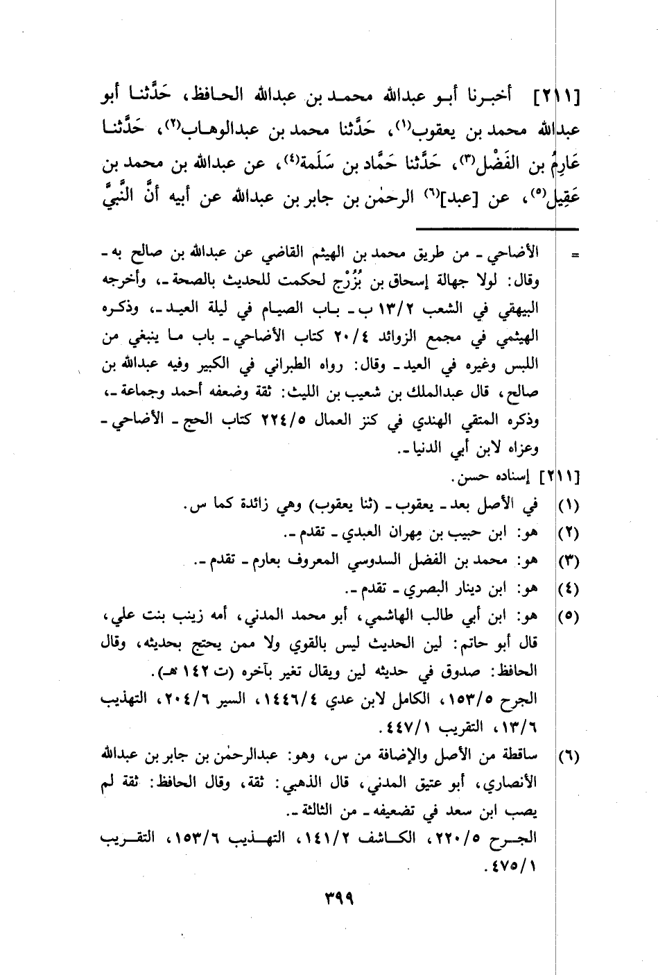 211 - أَخْبَرَنَا أَبُو عَبْدِ اللَّهِ مُحَمَّدُ بْنُ عَبْدِ اللَّهِ الْحَافِظُ حَدَّثَنَا أَبُو عَبْدِ اللَّهِ مُحَمَّدُ بْنُ يَعْقُوبَ حَدَّثَنَا يَعْقُوبُ حَدَّثَنَا مُحَمَّدُ بْنُ عَبْدِ الْوَهَّابِ، حَدَّثَنَا عَارِمُ بْنُ الْفَضْلِ، حَدَّثَنَا حَمَّادُ بْنُ سَلَمَةَ، عَنْ عَبْدِ اللَّهِ بْنِ مُحَمَّدِ بْنِ عَقِيلٍ، عَنْ عَبْدِ الرَّحْمَنِ بْنِ جَابِرِ بْنِ عَبْدِ اللَّهِ، عَنْ أَبِيهِ، أَنَّ النَّبِيَّ صَلَّى اللهُ عَلَيْهِ وَسَلَّمَ §-[400]- أَتَى بِكَبْشَيْنِ أَمْلَحَيْنِ أَقْرَنَيْنِ عَظِيمَيْنِ مَوْجُوءَيْنِ فَأَضْجَعَ أَحَدَهُمَا فَقَالَ: «بِسْمِ اللَّهِ، وَاللَّهُ أَكْبَرُ، اللَّهُمَّ هَذَا عَنْ مُحَمَّدٍ وَأُمَّتِهِ مِمَّنْ شَهِدَ لَكَ بِالتَّوْحِيدِ وَشَهِدَ لِي بِالْبَلَاغِ» وَرُوِيَ مِنْ وَجْهٍ آخَرَ فِي هَذَا الْحَدِيثِ فِي الْكَبْشِ الْأَوَّلِ «عَنْ مُحَمَّدٍ وَآلِ مُحَمَّدٍ»