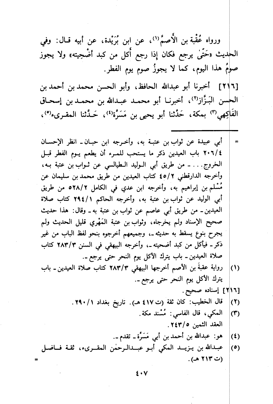 216 - أَخْبَرَنَا أَبُو عَبْدِ اللَّهِ الْحَافِظُ، وَأَبُو الْحَسَنِ مُحَمَّدُ بْنُ أَحْمَدَ بْنِ الْحَسَنِ الْبَزَّازُ، أَنْبَأَنَا أَبُو مُحَمَّدٍ عَبْدُ اللَّهِ بْنُ مُحَمَّدِ بْنِ إِسْحَاقَ الْفَاكِهِيُّ، بِمَكَّةَ، حَدَّثَنَا أَبُو يَحْيَى بْنُ مَسَرَّةَ، حَدَّثَنَا الْمُقْرِئُ، حَدَّثَنَا مُوسَى بْنُ عَلِيِّ بْنِ رَبَاحٍ، قَالَ: سَمِعْتُ أَبِي يُحَدِّثُ، عَنْ عُقْبَةَ بْنِ عَامِرٍ، أَنَّ رَسُولَ اللَّهِ صَلَّى اللهُ عَلَيْهِ وَسَلَّمَ قَالَ: §«يَوْمَ عَرَفَةَ وَيَوْمُ النَّحْرِ وَأَيَّامُ التَّشْرِيقِ عِيدُنَا أَهْلَ الْإِسْلَامِ وَهِيَ أَيَّامُ أَكْلٍ وَشُرْبٍ» قَالَ الشَّيْخُ رَضِيَ اللَّهُ عَنْهُ: وَأَرَادَ بِالْفِطْرِ يَوْمَ عَرَفَةَ فِي حَقِّ الْحَاجِّ، وَالْمَعْنَى فِي فِطْرِهِمْ هَذِهِ الْأَيَّامَ