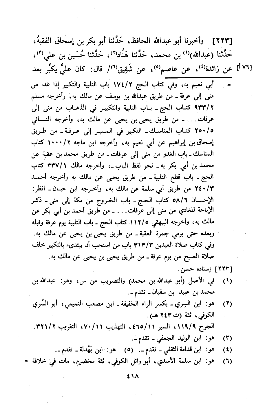223 - وَأَخْبَرَنَا أَبُو عَبْدِ الْحَافِظِ، حَدَّثَنَا أَبُو بَكْرِ بْنُ إِسْحَاقَ الْفَقِيهُ، حَدَّثَنَا عَبْدُ اللَّهِ بْنُ مُحَمَّدٍ، حَدَّثَنَا هَنَّادٌ، حَدَّثَنَا حُسَيْنُ بْنُ عَلِيٍّ، عَنْ زَائِدَةَ، عَنْ عَاصِمٍ، عَنْ شَقِيقٍ، قَالَ: §كَانَ عَلِيٌّ يُكَبِّرُ بَعْدَ صَلَاةِ الْفَجْرِ غَدَاةَ عَرَفَةَ ثُمَّ لَا يَقْطَعُ حَتَّى يُصَلِّيَ الْإِمَامُ مِنْ آخِرِ أَيَّامِ التَّشْرِيقِ ثُمَّ يُكَبِّرُ بَعْدَ الْعَصْرِ
