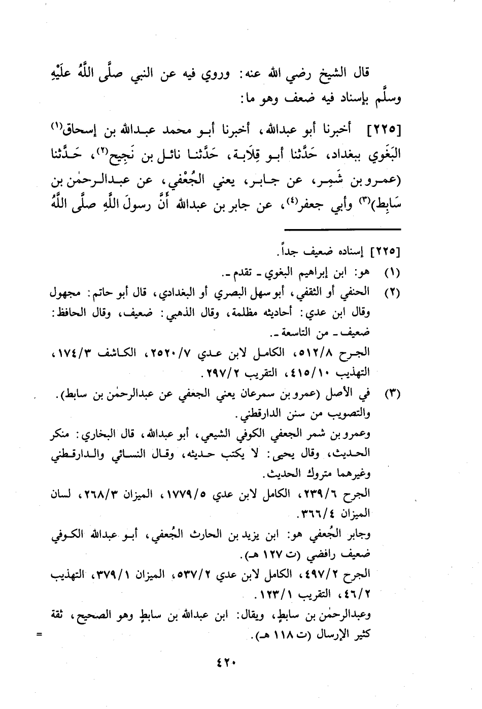 225 - أَخْبَرَنَا أَبُو عَبْدِ اللَّهِ، أَخْبَرَنَا أَبُو مُحَمَّدٍ عَبْدُ اللَّهِ بْنُ إِسْحَاقَ الْبَغَوِيُّ، بِبَغْدَادَ، حَدَّثَنَا أَبُو قِلَابَةَ، حَدَّثَنَا نَائِلُ بْنُ نَجِيحٍ، حَدَّثَنَا عَمْرُو بْنُ شَمِرٍ، عَنْ جَابِرٍ يَعْنِي الْجُعْفِيَّ، عَنْ عَبْدِ الرَّحْمَنِ بْنِ سَابِطٍ، وَأَبِي جَعْفَرٍ، عَنْ جَابِرِ بْنِ عَبْدِ اللَّهِ، أَنَّ رَسُولَ اللَّهِ صلّى الله -[421]- عليه وسلم كَانَ إِذَا صَلَّى الصُّبْحَ غَدَاةَ عَرَفَةَ قَالَ لِأَصْحَابِهِ: «عَلَى مَكَانِكُمْ» ثُمَّ يَقُولُ: «§اللَّهُ أَكْبَرُ اللَّهُ أَكْبَرُ، اللَّهُ أَكْبَرُ لَا إِلَهَ إِلَّا اللَّهُ، وَاللَّهُ أَكْبَرُ اللَّهُ أَكْبَرُ وَلِلَّهِ الْحَمْدُ،» فَيُكَبِّرُ عَنْ غَدَاةِ عَرَفَةَ إِلَى صَلَاةِ الْعَصْرِ مِنْ أَيَّامِ التَّشْرِيقِ قَالَ الشَّيْخُ رَضِيَ اللَّهُ عَنْهُ: تَابَعَهُ عَبْدُ الرَّحْمَنِ بْنُ مُسْهِرٍ، عَنْ -[422]- عَمْرِو بْنِ شَمِرٍ دُونَ ذِكْرِ أَبِي جَعْفَرٍ، مُخْتَصَرًا وَرُوِيَ مِنْ وَجْهٍ آخَرَ كَمَا: