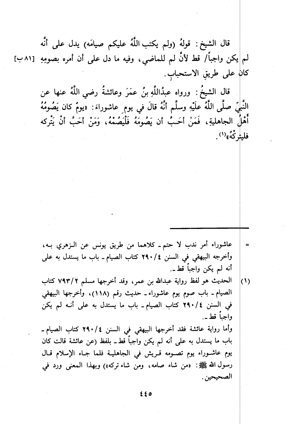 قَالَ الشَّيْخُ: وَرَوَاهُ عَبْدُ اللَّهِ بْنُ عُمَرَ وَعَائِشَةُ رَضِيَ اللَّهُ عَنْهَا عَنِ النَّبِيِّ صَلَّى اللهُ عَلَيْهِ وَسَلَّمَ أَنَّهُ قَالَ فِي يَوْمِ عَاشُورَاءَ: §«يَوْمٌ كَانَ يَصُومُهُ أَهْلُ الْجَاهِلِيَّةِ فَمَنْ أَحَبَّ أَنْ يَصُومَهُ فَلْيَصُمْهُ وَمَنْ أَحَبَّ أَنْ يَتْرُكَهُ فَلْيَتْرُكْهُ»