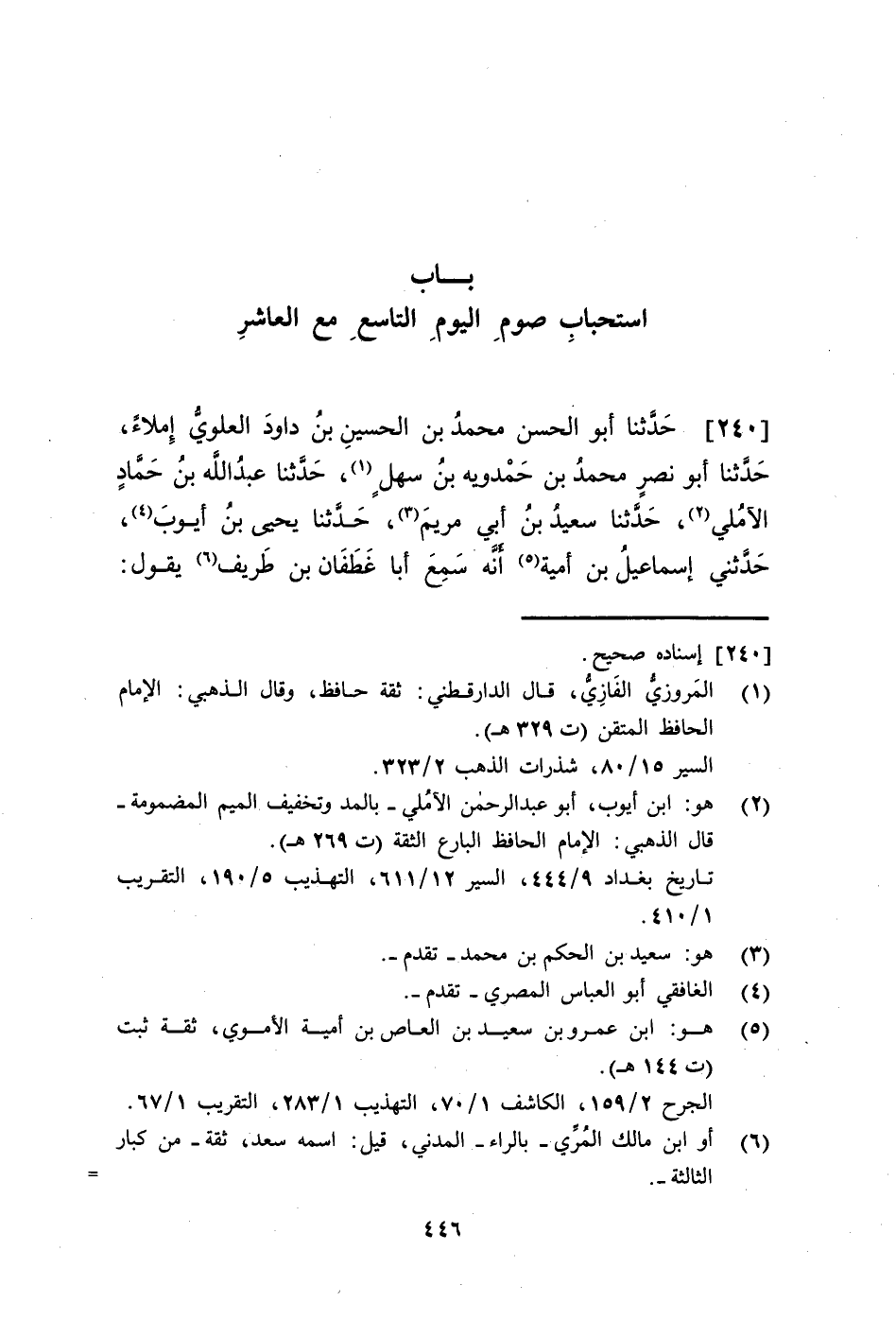 240 - حَدَّثَنَا أَبُو الْحَسَنِ مُحَمَّدُ بْنُ الْحُسَيْنِ بْنِ دَاوُدَ الْعَلَوِيُّ إِمْلَاءً، حَدَّثَنَا أَبُو نَصْرٍ مُحَمَّدُ بْنُ حَمْدَوَيْهِ بْنِ سَهْلٍ، حَدَّثَنَا عَبْدُ اللَّهِ بْنُ حَمَّادٍ الْآمُلِيُّ، حَدَّثَنَا سَعِيدُ بْنُ أَبِي مَرْيَمَ، حَدَّثَنَا يَحْيَى بْنُ أَيُّوبَ، حَدَّثَنِي إِسْمَاعِيلُ بْنُ أُمَيَّةَ، أَنَّهُ سَمِعَ أَبَا غَطَفَانَ بْنَ طَرِيفٍ، يَقُولُ -[447]-: سَمِعْتُ عَبْدَ اللَّهِ بْنَ عَبَّاسٍ، يَقُولُ: حِينَ صَامَ رَسُولُ اللَّهِ صَلَّى اللهُ عَلَيْهِ وَسَلَّمَ يَوْمَ عَاشُورَاءَ وَأَمَرَ بِصِيَامِهِ قَالُوا: يَا رَسُولَ اللَّهِ، إِنَّهُ يَوْمٌ تُعَظِّمُهُ الْيَهُودُ وَالنَّصَارَى فَقَالَ رَسُولُ اللَّهِ صَلَّى اللهُ عَلَيْهِ وَسَلَّمَ: §«فَإِذَا كَانَ الْعَامُ الْمُقْبِلُ صُمْنَا يَوْمَ التَّاسِعِ إِنْ شَاءَ اللَّهُ تَعَالَى» قَالَ: فَلَمْ يَأْتِ الْعَامُ الْمُقْبِلُ حَتَّى تُوُفِّيَ رَسُولُ اللَّهِ صَلَّى اللهُ عَلَيْهِ وَسَلَّمَ