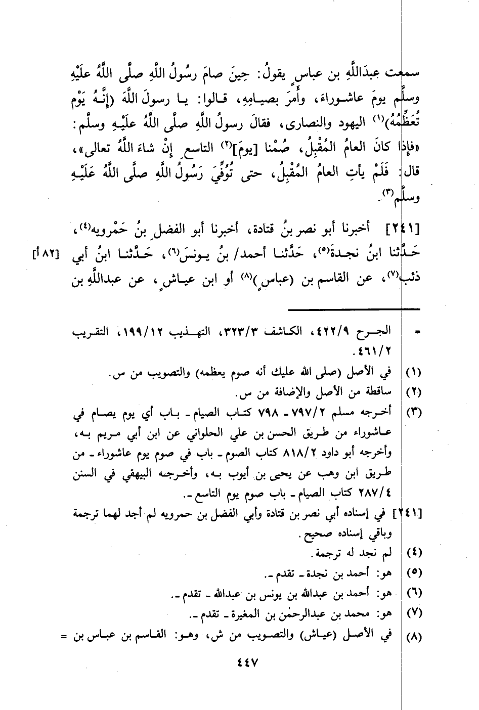 241 - أَخْبَرَنَا أَبُو نَصْرِ بْنُ قَتَادَةَ، أَنْبَأَنَا أَبُو الْفَضْلِ بْنُ حَمْرَوَيْهِ، حَدَّثَنَا ابْنُ نَجْدَةَ، حَدَّثَنَا أَحْمَدُ بْنُ يُونُسَ، حَدَّثَنَا ابْنُ أَبِي ذِئْبٍ، عَنِ الْقَاسِمِ بْنِ عَبَّاسٍ، أَوِ ابْنِ عَيَّاشٍ، عَنْ عَبْدِ اللَّهِ بْنِ عُمَيْرٍ، عَنِ ابْنِ عَبَّاسٍ، قَالَ: قَالَ رَسُولُ اللَّهِ صَلَّى اللهُ عَلَيْهِ وَسَلَّمَ: §«إِنْ عِشْتُ إِنْ شَاءَ اللَّهُ إِلَى قَابِلٍ صُمْتُ التَّاسِعَ» قَالَ: مَخَافَةَ أَنْ يَفُوتَهُ يَعْنِي يَوْمَ عَاشُورَاءَ قَالَ الشَّيْخُ رَضِيَ اللَّهُ عَنْهُ: وَقَدْ أَشَارَ الشَّافِعِيُّ رَضِيَ اللَّهُ عَنْهُ فِي صَوْمِ يَوْمِ التَّاسِعِ إِلَى هَذَا الْمَعْنَى