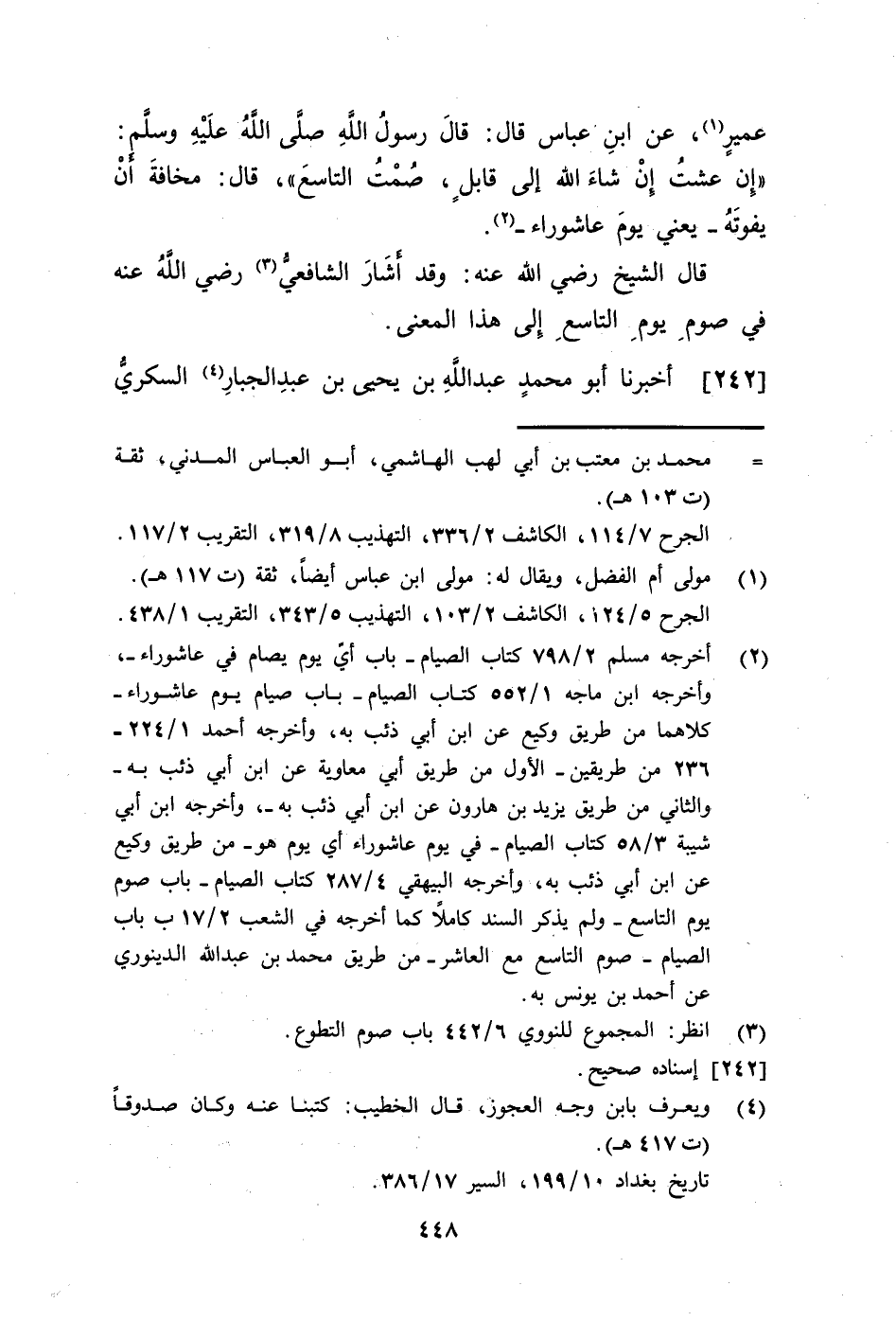 242 - أَخْبَرَنَا أَبُو مُحَمَّدٍ عَبْدُ اللَّهِ بْنُ يَحْيَى بْنِ عَبْدِ الْجَبَّارِ السُّكَّرِيُّ، بِبَغْدَادَ، أَنْبَأَنَا إِسْمَاعِيلُ بْنُ مُحَمَّدٍ الصَّفَّارُ، حَدَّثَنَا أَحْمَدُ بْنُ مَنْصُورٍ، حَدَّثَنَا عَبْدُ الرَّزَّاقِ، أَنْبَأَنَا ابْنُ جُرَيْجٍ، أَخْبَرَنِي عَطَاءٌ، أَنَّهُ سَمِعَ ابْنَ عَبَّاسٍ، يَقُولُ: §صُومُوا التَّاسِعَ وَالْعَاشِرَ وَخَالِفُوا الْيَهُودَ قَالَ الشَّيْخُ رَضِيَ اللَّهُ عَنْهُ: وَهَذَا مَوْقُوفٌ عَلَى ابْنِ عَبَّاسٍ، وَهُوَ يُوَافِقُ رِوَايَةَ أَبِي غَطَفَانَ، عَنِ ابْنِ عَبَّاسٍ، عَنِ النَّبِيِّ صَلَّى اللهُ عَلَيْهِ وَسَلَّمَ فِي عَزْمِهِ عَلَى صِيَامِ التَّاسِعِ مُخَالَفَةً لِلْيَهُودِ وَهُوَ أَحَدُ الْمَعْنَيَيْنِ فِي يَوْمِ صَوْمِ التَّاسِعِ مَعَ الْعَاشِرِ، وَقَدْ رُوِيَ مِنْ وَجْهٍ آخَرَ مَرْفُوعًا كَمَا