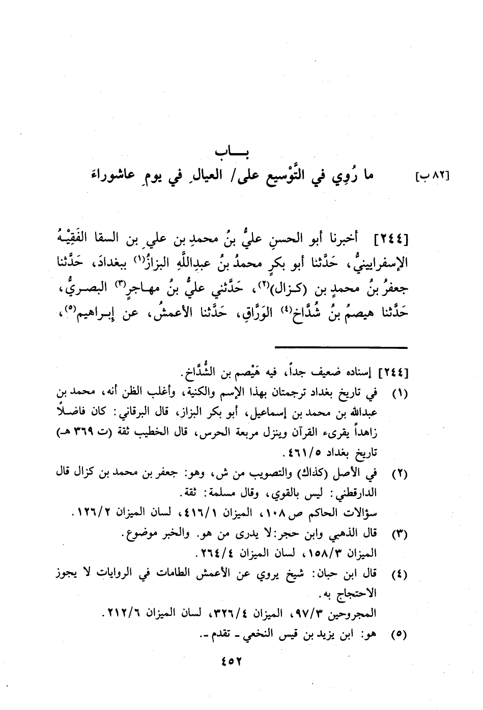 244 - أَخْبَرَنَا أَبُو الْحَسَنِ عَلِيُّ بْنُ مُحَمَّدِ بْنِ عَلِيِّ بْنِ السَّقَّا الْفَقِيهُ الْإِسْفِرَايِينِيُّ، حَدَّثَنَا أَبُو بَكْرٍ مُحَمَّدُ بْنُ عَبْدِ اللَّهِ الْبَزَّازُ بِبَغْدَادَ، حَدَّثَنَا جَعْفَرُ بْنُ مُحَمَّدِ بْنِ كَزَالٍ، حَدَّثَنِي عَلِيُّ بْنُ مُهَاجِرٍ الْبَصْرِيُّ، حَدَّثَنَا هَيْصَمُ بْنُ شَدَاخٍ الْوَرَّاقُ، حَدَّثَنَا الْأَعْمَشُ، عَنْ إِبْرَاهِيمَ، عَنْ عَلْقَمَةَ، عَنْ عَبْدِ اللَّهِ، قَالَ: قَالَ رَسُولُ اللَّهِ صَلَّى اللهُ عَلَيْهِ وَسَلَّمَ: §«مَنْ وَسَّعَ عَلَى عِيَالِهِ يَوْمَ عَاشُورَاءَ وَسَّعَ اللَّهُ عَلَيْهِ فِي سَائِرِ سَنَتِهِ»