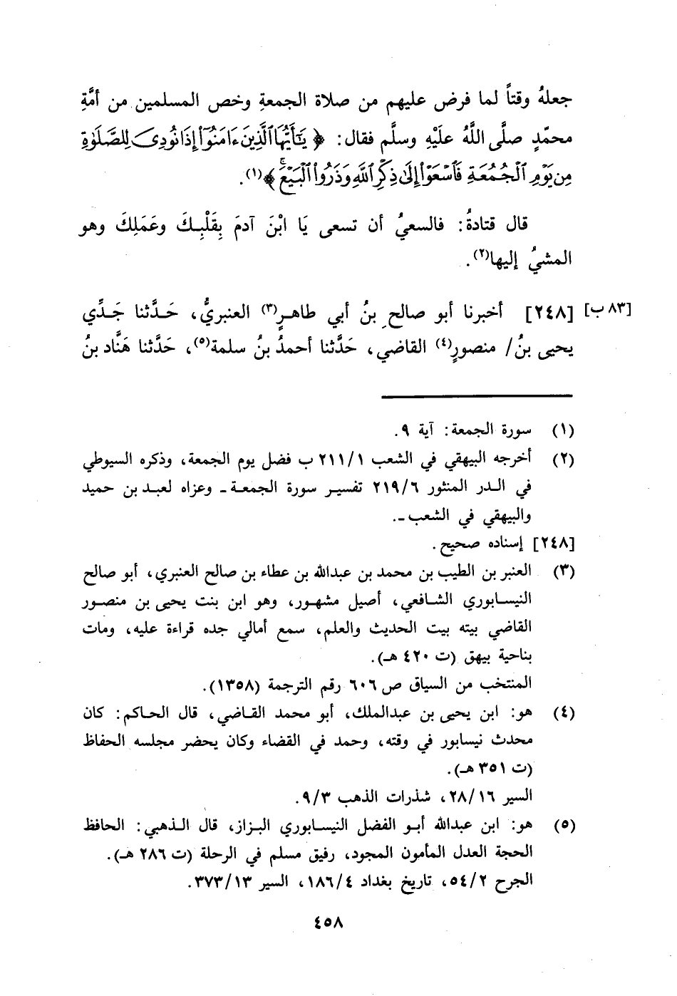 248 - أَخْبَرَنَا أَبُو صَالِحٍ ابْنُ أَبِي طَاهِرٍ الْعَنْبَرِيُّ، حَدَّثَنَا جَدِّي يَحْيَى بْنُ مَنْصُورٍ الْقَاضِي، حَدَّثَنَا أَحْمَدُ بْنُ سَلَمَةَ، حَدَّثَنَا هَنَّادُ بْنُ -[459]- السَّرِيِّ، حَدَّثَنَا ابْنُ فُضَيْلٍ، عَنْ أَبِي مَالِكٍ الْأَشْجَعِيِّ، عَنْ أَبِي حَازِمٍ، عَنْ أَبِي هُرَيْرَةَ، وَعَنْ رِبْعِيٍّ، عَنْ حُذَيْفَةَ الْيَمَانِيِّ، قَالَا: قَالَ رَسُولُ اللَّهِ صَلَّى اللهُ عَلَيْهِ وَسَلَّمَ: §«أَضَلَّ اللَّهُ عَنِ الْجُمُعَةِ مَنْ كَانَ قَبْلَنَا فَكَانَ لِلْيَهُودِ يَوْمُ السَّبْتِ وَكَانَ لِلنَّصَارَى يَوْمُ الْأَحَدِ فَجَاءَ اللَّهُ بِنَا فَهَدَانَا لِيَوْمِ الْجُمُعَةِ فَجَعَلَ الْجُمُعَةَ وَالسَّبْتَ وَالْأَحَدَ وَكَذَلِكَ هُمْ تَبَعٌ لَنَا يَوْمَ الْقِيَامَةِ، نَحْنُ الْآخَرُونَ مِنْ أَهْلِ الدُّنْيَا وَالْأَوَّلُونَ يَوْمَ الْقِيَامَةِ، الْمَقْضِيُّ لَهُمْ يَوْمَ الْقِيَامَةِ قَبْلَ الْخَلَائِقِ»