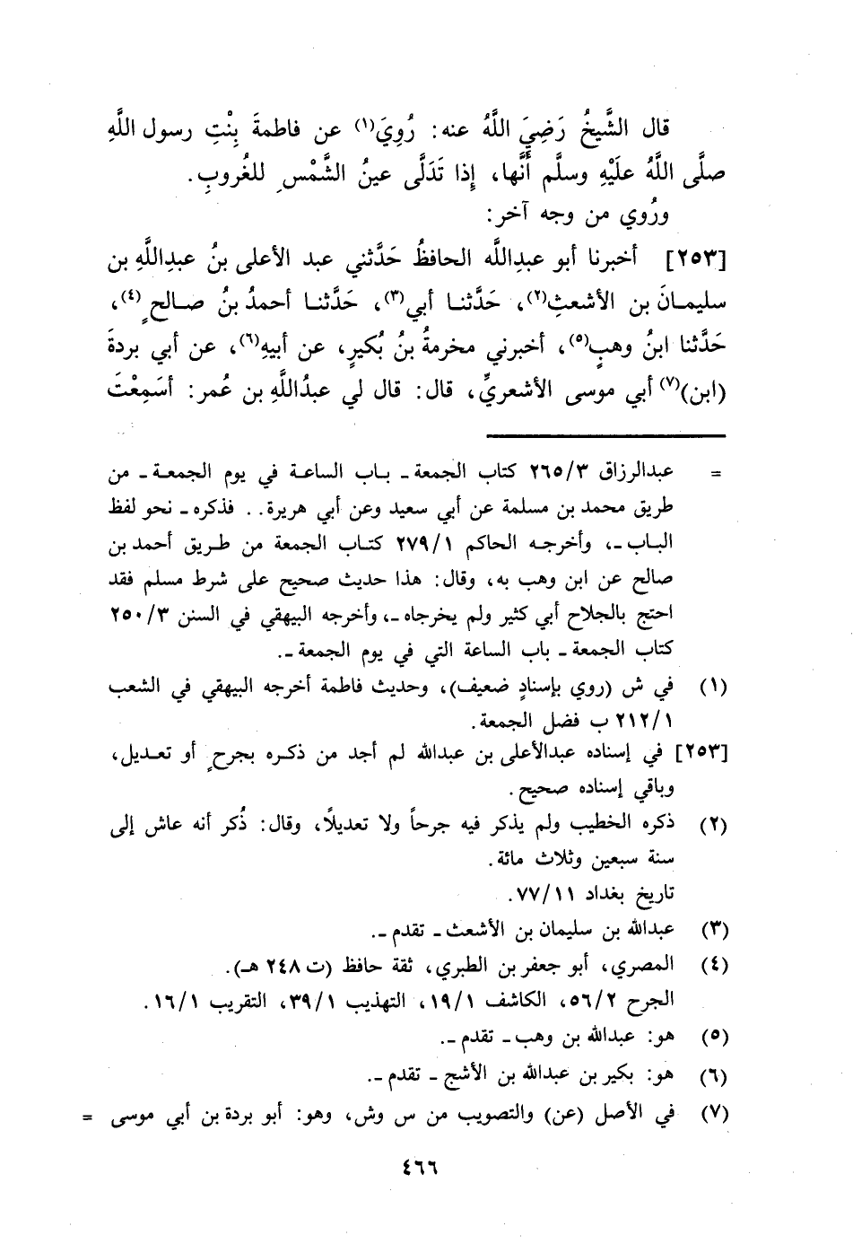 253 - أَخْبَرَنَا أَبُو عَبْدِ اللَّهِ الْحَافِظُ، حَدَّثَنِي عَبْدُ الْأَعْلَى بْنُ عَبْدِ اللَّهِ بْنِ سُلَيْمَانَ بْنِ الْأَشْعَثِ، حَدَّثَنَا أَبِي، حَدَّثَنَا أَحْمَدُ بْنُ صَالِحٍ، حَدَّثَنَا ابْنُ وَهْبٍ، أَخْبَرَنِي مَخْرَمَةُ بْنُ بُكَيْرٍ، عَنْ أَبِيهِ، عَنْ أَبِي بُرْدَةَ ابْنِ أَبِي مُوسَى الْأَشْعَرِيِّ، قَالَ: قَالَ لِي عَبْدُ اللَّهِ بْنُ عُمَرَ: أَسَمِعْتَ -[467]- أَبَاكَ يُحَدِّثُ عَنْ رَسُولِ اللَّهِ صَلَّى اللهُ عَلَيْهِ وَسَلَّمَ فِي شَأْنِ سَاعَةِ الْجُمُعَةِ؟ قَالَ: قُلْتُ: نَعَمْ سَمِعْتُهُ يَقُولُ: سَمِعْتُ رَسُولَ اللَّهِ صَلَّى اللهُ عَلَيْهِ وَسَلَّمَ يَقُولُ: §«هِيَ مَا بَيْنَ أَنْ يَجْلِسَ الْإِمَامُ إِلَى أَنْ يَقْضِيَ الصَّلَاةَ» قَالَ الشَّيْخُ رَضِيَ اللَّهُ عَنْهُ: وَكَانَ النَّبِيُّ صَلَّى اللهُ عَلَيْهِ وَسَلَّمَ يَعْلَمُ هَذِهِ السَّاعَةَ بِعَيْنِهَا ثُمَّ إِنَّهُ أُنْسِيَهَا كَمَا أَنْسِيَتْ لَيْلَةُ الْقَدْرِ؛ لِيَسْتَغْرِقَ الْعَبْدُ جَمِيعَ النَّهَارِ بِالذِّكْرِ وَالدُّعَاءِ