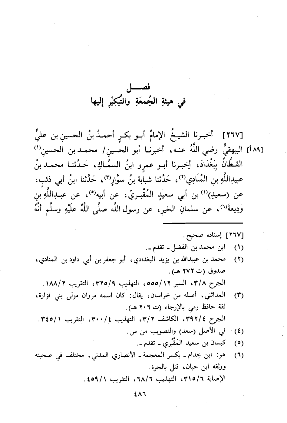267 - أَنْبَأَنَا أَبُو الْحُسَيْنِ مُحَمَّدُ بْنُ الْحُسَيْنِ الْقَطَّانُ بِبَغْدَادَ، أَنْبَأَنَا أَبُو عَمْرِو بْنُ السَّمَّاكِ، حَدَّثَنَا مُحَمَّدُ بْنُ عُبَيْدِ اللَّهِ بْنِ الْمُنَادِي، حَدَّثَنَا شَبَابَةُ بْنُ سَوَّارٍ، حَدَّثَنَا ابْنُ أَبِي ذِئْبٍ، عَنْ سَعِيدِ بْنِ أَبِي سَعِيدٍ الْمَقْبُرِيِّ، عَنْ أَبِيهِ، عَنْ عَبْدِ اللَّهِ بْنِ وَدِيعَةَ، عَنْ سَلْمَانَ الْخَيْرِ، عَنْ رَسُولِ اللَّهِ صَلَّى اللهُ عَلَيْهِ وَسَلَّمَ أَنَّهُ قَالَ: §«لَا يَغْتَسِلُ رَجُلٌ يَوْمَ الْجُمُعَةِ ثُمَّ يَمَسُّ مِنْ دُهْنِهِ أَوْ طِيبِ أَهْلِهِ ثُمَّ يَأْتِي الْمَسْجِدَ وَلَا يُفَرِّقُ بَيْنَ اثْنَيْنِ ثُمَّ يُنْصِتُ إِذَا تَكَلَّمَ الْإِمَامُ إِلَّا غُفِرَ لَهُ مَا بَيْنَهُ وَبَيْنَ الْجُمُعَةِ الْأُخْرَى» وَرَوَاهُ غَيْرُهُ عَنِ ابْنِ أَبِي ذِئْبٍ، وَزَادَ فِيهِ «وَيَتَطَهَّرُ مَا اسْتَطَاعَ مِنْ طُهْرٍ»