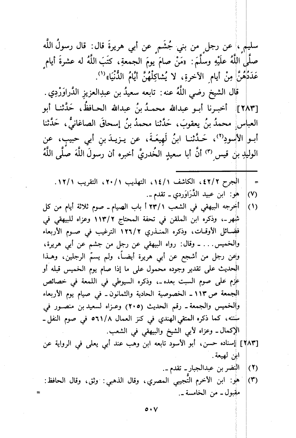 283 - أَخْبَرَنَا أَبُو عَبْدِ اللَّهِ مُحَمَّدُ بْنُ عَبْدِ اللَّهِ الْحَافِظُ، حَدَّثَنَا أَبُو الْعَبَّاسِ مُحَمَّدُ بْنُ يَعْقُوبَ، حَدَّثَنَا مُحَمَّدُ بْنُ إِسْحَاقَ الصَّاغَانِيُّ، حَدَّثَنَا أَبُو الْأَسْوَدِ، حَدَّثَنَا ابْنُ لَهِيعَةَ، عَنْ يَزِيدَ بْنِ أَبِي حَبِيبٍ، عَنِ الْوَلِيدِ بْنِ قَيْسٍ، أَنَّ أَبَا سَعِيدٍ الْخُدْرِيَّ أَخْبَرَهُ أَنَّ رَسُولَ اللَّهِ صَلَّى اللهُ عَلَيْهِ وَسَلَّمَ يَقُولُ: «§مَنْ وَافَقَ صِيَامَ يَوْمِ الْجُمُعَةِ وَعَادَ مَرِيضًا وَشَهِدَ جِنَازَةً، وَتَصَدَّقَ، وَأَعْتَقَ رَقَبَةً وَجَبَتْ لَهُ الْجَنَّةُ ذَلِكَ الْيَوْمَ إِنْ شَاءَ اللَّهُ تَعَالَى»