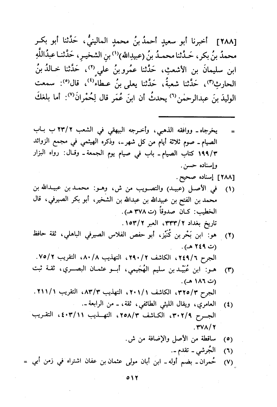 288 - أَخْبَرَنَا أَبُو سَعِيدٍ أَحْمَدُ بْنُ مُحَمَّدٍ الْمَالِينِيُّ، حَدَّثَنَا أَبُو بَكْرٍ مُحَمَّدُ بْنُ بَكْرٍ، حَدَّثَنَا مُحَمَّدُ بْنُ عُبَيْدِ اللَّهِ بْنِ الشِّخِّيرِ، حَدَّثَنَا عَبْدُ اللَّهِ بْنُ سُلَيْمَانَ بْنِ الْأَشْعَثِ، حَدَّثَنَا عَمْرُو بْنُ عَلِيٍّ، حَدَّثَنَا خَالِدُ بْنُ الْحَارِثِ، حَدَّثَنَا شُعْبَةُ، حَدَّثَنَا يَعْلَى بْنُ عَطَاءٍ، قَالَ: سَمِعْتُ الْوَلِيدَ بْنَ عَبْدِ الرَّحْمَنِ، يُحَدِّثُ أَنَّ ابْنَ عُمَرَ، قَالَ لِحُمْرَانَ: أَمَا بَلَغَكَ أَنَّ رَسُولَ اللَّهِ صَلَّى اللهُ عَلَيْهِ وَسَلَّمَ قَالَ: §«إِنَّ أَفْضَلَ الصَّلَوَاتِ عِنْدَ اللَّهِ صَلَاةُ الصُّبْحِ يَوْمَ الْجُمُعَةِ فِي جَمَاعَةٍ»