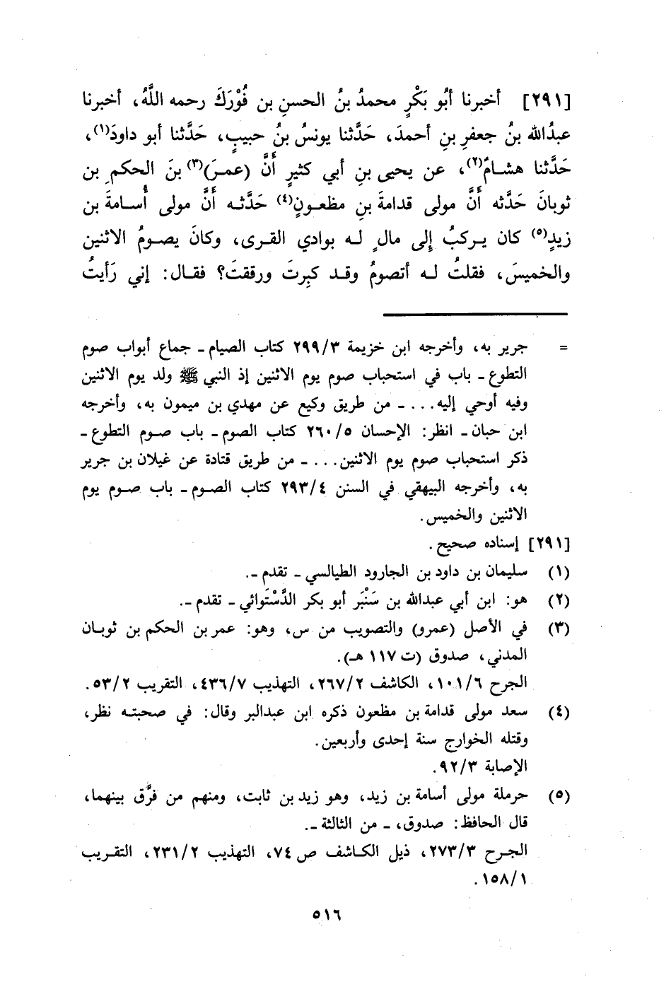 291 - أَخْبَرَنَا أَبُو بَكْرٍ مُحَمَّدُ بْنُ الْحَسَنِ بْنِ فُورَكٍ رَحِمَهُ اللَّهُ، أَنْبَأَنَا عَبْدُ اللَّهِ بْنُ جَعْفَرِ بْنِ أَحْمَدَ، حَدَّثَنَا يُونُسُ بْنُ حَبِيبٍ، حَدَّثَنَا أَبُو دَاوُدَ، حَدَّثَنَا هِشَامٌ، عَنْ يَحْيَى بْنِ أَبِي كَثِيرٍ، أَنَّ عُمَرَ بْنَ الْحَكَمِ بْنِ ثَوْبَانَ، حَدَّثَهُ أَنَّ مَوْلَى قُدَامَةَ بْنِ مَظْعُونٍ , حَدَّثَهُ أَنَّ مَوْلَى أُسَامَةَ بْنِ زَيْدٍ كَانَ يَرْكَبُ إِلَى مَالٍ لَهُ بِوَادِي الْقُرَى وَكَانَ يَصُومُ يَوْمَ الِاثْنَيْنِ وَالْخَمِيسِ فَقُلْتُ لَهُ: أَتَصُومُ وَقَدْ كَبِرْتَ وَرَقَقْتَ؟ فَقَالَ: إِنِّي رَأَيْتُ -[517]- رَسُولَ اللَّهِ صَلَّى اللهُ عَلَيْهِ وَسَلَّمَ يَصُومُ الِاثْنَيْنِ وَالْخَمِيسَ فَقُلْتُ: يَا رَسُولَ اللَّهِ، أَتَصُومُ يَوْمَ الِاثْنَيْنِ وَالْخَمِيسِ؟ فَقَالَ: §«إِنَّ الْأَعْمَالَ تُعْرَضَ يَوْمَ الِاثْنَيْنِ وَالْخَمِيسِ»