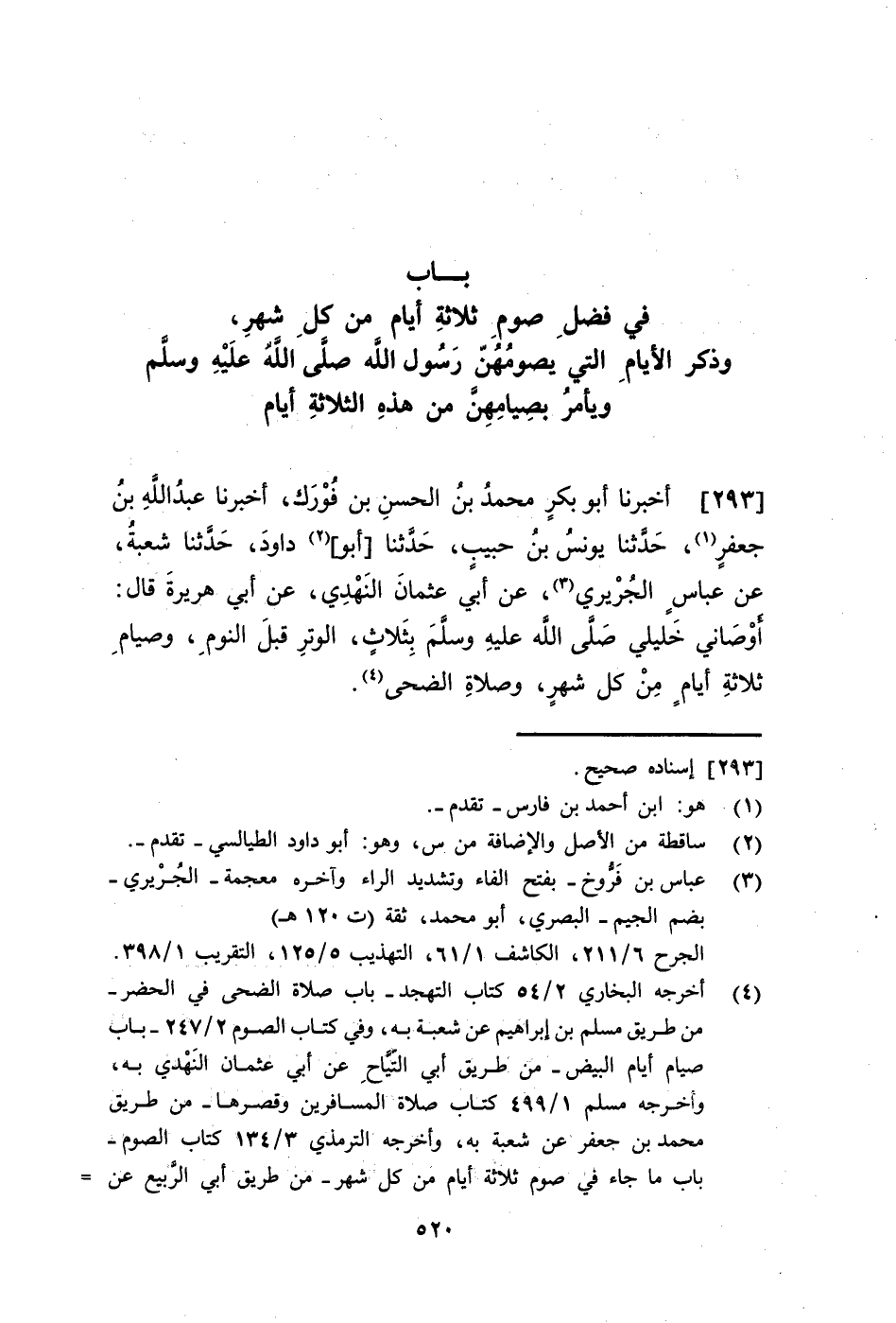 293 - أَخْبَرَنَا أَبُو بَكْرٍ مُحَمَّدُ بْنُ الْحَسَنِ بْنِ فُورَكٍ أَنبأَنَا عَبْدُ اللَّهِ بْنُ جَعْفَرٍ، حَدَّثَنَا يُونُسُ بْنُ حَبِيبٍ، حَدَّثَنَا أَبُو دَاوُدَ، حَدَّثَنَا شُعْبَةُ، عَنْ عَبَّاسٍ الْجُرَيْرِيِّ، عَنْ أَبِي عُثْمَانَ النَّهْدِيِّ، عَنْ أَبِي هُرَيْرَةَ، قَالَ: §أَوْصَانِي خَلِيلِي صَلَّى اللهُ عَلَيْهِ وَسَلَّمَ بِثَلَاثٍ: الْوِتْرِ قَبْلَ النَّوْمِ وَصِيَامِ ثَلَاثَةِ أَيَّامٍ مِنْ كُلِّ شَهْرٍ وَصَلَاةِ الضُّحَى "