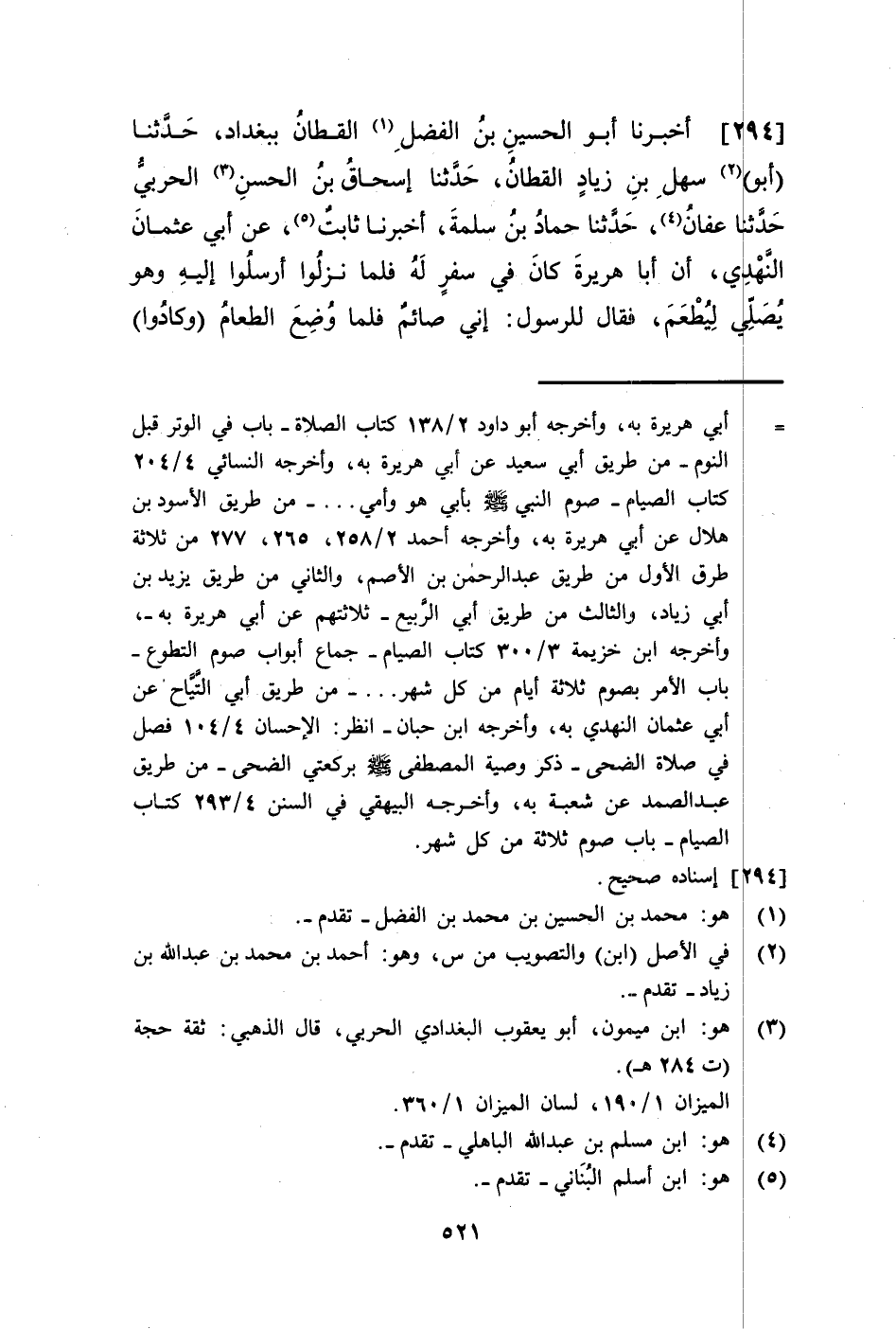 294 - أَخْبَرَنَا أَبُو الْحُسَيْنِ بْنُ الْفَضْلِ الْقَطَّانُ، بِبَغْدَادَ، حَدَّثَنَا أَبُو سَهْلِ بْنُ زِيَادٍ الْقَطَّانُ، حَدَّثَنَا إِسْحَاقُ بْنُ الْحَسَنِ الْحَرْبِيُّ، حَدَّثَنَا عَفَّانُ، حَدَّثَنَا حَمَّادُ بْنُ سَلَمَةَ، أَنبأَنَا ثَابِتٌ، عَنْ أَبِي عُثْمَانَ النَّهْدِيِّ، أَنَّ أَبَا هُرَيْرَةَ، كَانَ فِي سَفَرٍ لَهُ فَلَمَّا نَزَلُوا أَرْسَلُوا إِلَيْهِ وَهُوَ يُصَلِّي لِيَطْعَمَ فَقَالَ لِلرَّسُولِ: إِنِّي صَائِمٌ فَلَمَّا وُضِعَ الطَّعَامُ وَكَادُوا -[522]- يَفْرُغُونَ قَالَ: فَجَاءَ فَجَعَلَ يَأْكُلُ فَنَظَرَ الْقَوْمُ إِلَى رَسُولِهِمْ فَقَالَ: مَا تَنْظُرُونَ؟ قَدْ أَخْبَرَنِي أَنَّهُ صَائِمٌ، فَقَالَ أَبُو هُرَيْرَةَ: صَدَقَ، إِنِّي سَمِعْتُ رَسُولَ اللَّهِ صَلَّى اللهُ عَلَيْهِ وَسَلَّمَ يَقُولُ: «§صَوْمُ شَهْرِ الصَّبْرِ، وَصَوْمُ ثَلَاثَةِ أَيَّامٍ مِنْ كُلِّ شَهْرٍ صَوْمُ الدَّهْرِ» فَقَدْ صُمْتُ ثَلَاثَةَ أَيَّامٍ مِنَ الشَّهْرِ فَأَنَا مُفْطِرٌ فِي تَخْفِيفِ اللَّهِ، وَصَائِمٌ فِي تَضْعِيفِ اللَّهِ