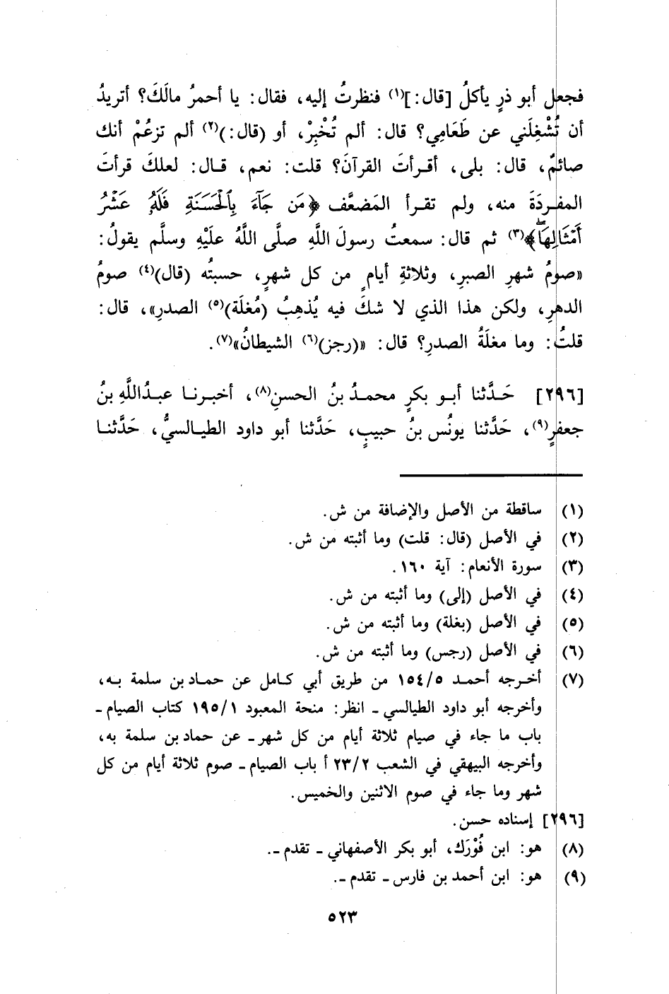 296 - حَدَّثَنَا أَبُو بَكْرٍ مُحَمَّدُ بْنُ الْحَسَنِ أَنبأَنَا عَبْدُ اللَّهِ بْنُ جَعْفَرٍ، حَدَّثَنَا يُونُسُ بْنُ حَبِيبٍ، حَدَّثَنَا أَبُو دَاوُدَ الطَّيَالِسِيُّ، حَدَّثَنَا -[524]- شَيْبَانُ، عَنْ عَاصِمٍ، عَنْ زِرٍّ، عَنْ عَبْدِ اللَّهِ بْنِ مَسْعُودٍ، أَنَّ رَسُولَ اللَّهِ صَلَّى اللهُ عَلَيْهِ وَسَلَّمَ كَانَ §يَصُومُ ثَلَاثَةَ أَيَّامٍ مِنْ غُرَّةِ كُلِّ شَهْرٍ "