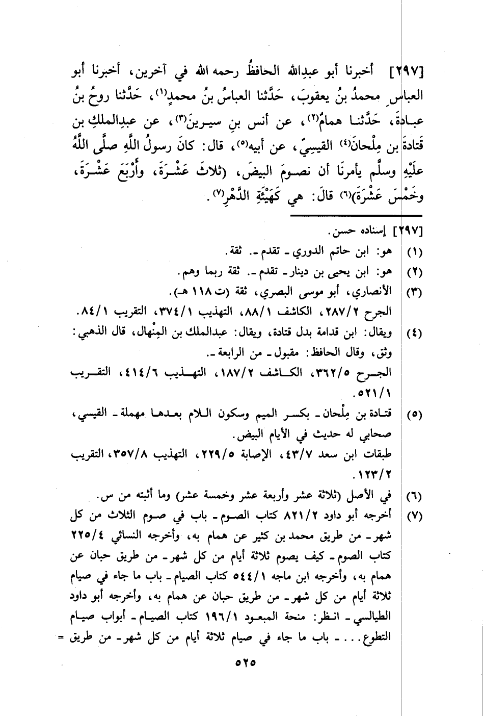 297 - أَخْبَرَنَا أَبُو عَبْدِ اللَّهِ الْحَافِظُ، رَحِمَهُ اللَّهُ فِي آخَرِينَ، أَنْبَأَنَا أَبُو الْعَبَّاسِ مُحَمَّدُ بْنُ يَعْقُوبَ، حَدَّثَنَا الْعَبَّاسُ بْنُ مُحَمَّدٍ، حَدَّثَنَا رَوْحُ بْنُ عُبَادَةَ، حَدَّثَنَا هَمَّامٌ عَنْ أَنَسِ بْنِ سِيرِينَ، عَنْ عَبْدِ الْمَلِكِ بْنِ قَتَادَةَ بْنِ مِلْحَانَ الْقَيْسِيِّ، عَنْ أَبِيهِ قَالَ: كَانَ رَسُولُ اللَّهِ صَلَّى اللهُ عَلَيْهِ وَسَلَّمَ §يَأْمُرُنَا أَنْ نَصُومَ الْبِيضَ ثَلَاثَ عَشْرَةَ وَأَرْبَعَ عَشْرَةَ وَخَمْسَ عَشْرَةَ، قَالَ: «هِيَ كَهَيْئَةِ الدَّهْرِ»
