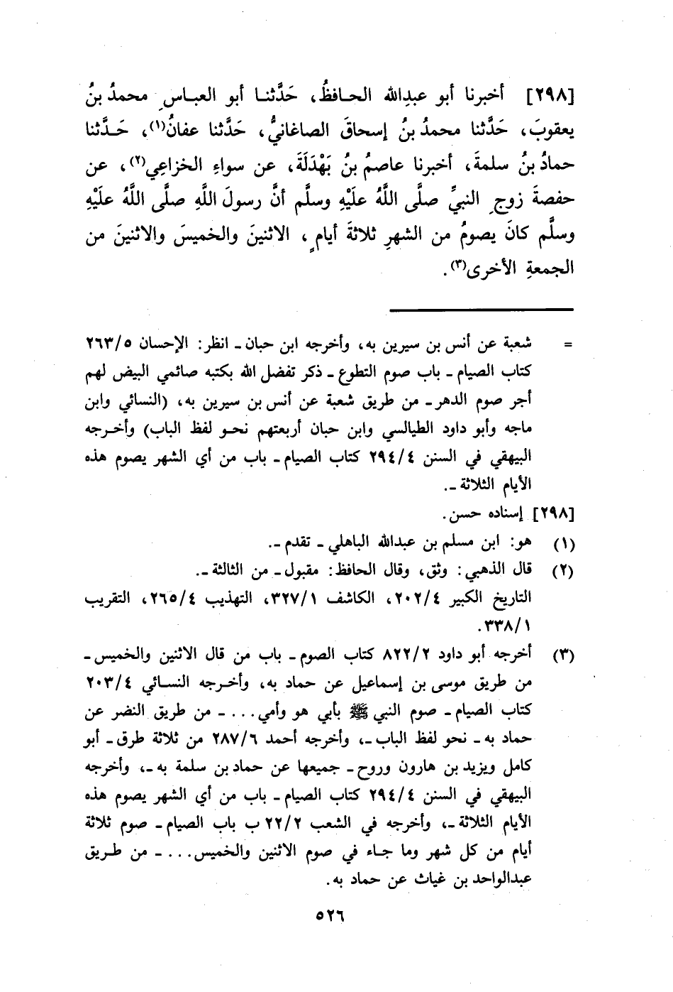 298 - أَخْبَرَنَا أَبُو عَبْدِ اللَّهِ الْحَافِظُ، حَدَّثَنَا أَبُو الْعَبَّاسِ مُحَمَّدُ بْنُ يَعْقُوبَ، حَدَّثَنَا مُحَمَّدُ بْنُ إِسْحَاقَ الصَّاغَانِيُّ، حَدَّثَنَا عَفَّانُ، حَدَّثَنَا حَمَّادُ بْنُ سَلَمَةَ، أَنبأَنَا عَاصِمُ ابْنُ بَهْدَلَةَ، عَنْ سَوَاءٍ الْخُزَاعِيِّ، عَنْ حَفْصَةَ، زَوْجِ النَّبِيِّ صَلَّى اللهُ عَلَيْهِ وَسَلَّمَ أَنَّ رَسُولَ اللَّهِ صَلَّى اللهُ عَلَيْهِ وَسَلَّمَ كَانَ §يَصُومُ مِنَ الشَّهْرِ ثَلَاثَةَ أَيَّامٍ الِاثْنَيْنِ وَالْخَمِيسَ وَالِاثْنَيْنِ مِنَ الْجُمُعَةِ الْأُخْرَى "