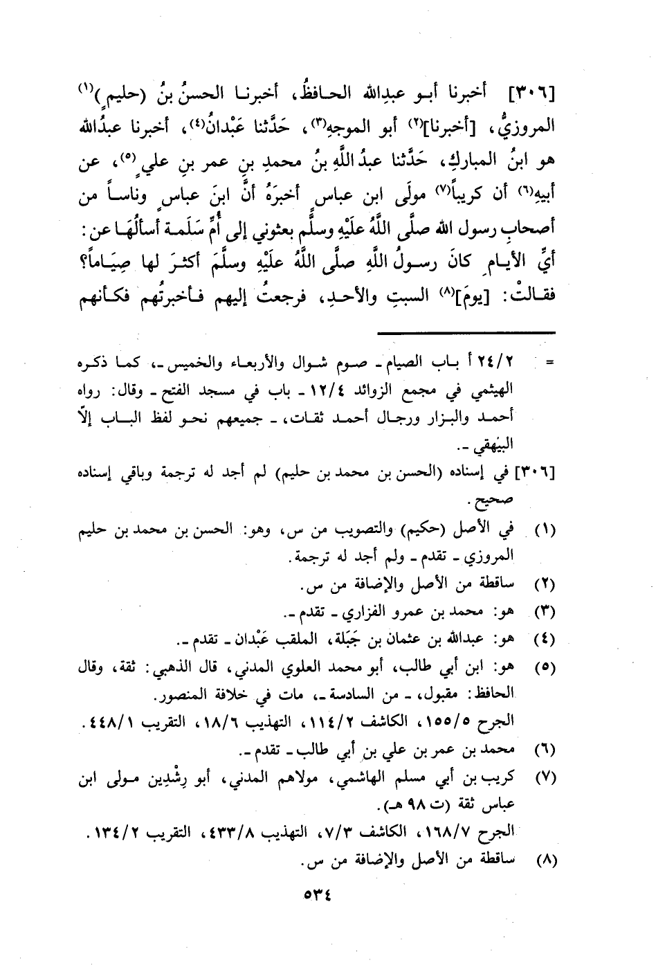 306 - أَخْبَرَنَا أَبُو عَبْدِ اللَّهِ الْحَافِظُ، أَنْبَأَنَا الْحَسَنُ بْنُ حَلِيمٍ الْمَرْوَزِيُّ، أَخْبَرَنَا أَبُو الْمُوَجِّهِ، حَدَّثَنَا عَبْدَانُ، أَنْبَأَنَا عَبْدُ اللَّهِ هُوَ ابْنُ الْمُبَارَكِ، حَدَّثَنَا عَبْدُ اللَّهِ بْنُ مُحَمَّدِ بْنِ عُمَرَ بْنِ عَلِيٍّ، عَنْ أَبِيهِ، أَنَّ كُرَيْبًا مَوْلَى ابْنِ عَبَّاسٍ أَخْبَرَهُ، أَنَّ ابْنَ عَبَّاسٍ وَنَاسًا مِنْ أَصْحَابِ رَسُولِ اللَّهِ صَلَّى اللهُ عَلَيْهِ وَسَلَّمَ بَعَثُونِي إِلَى أُمِّ سَلَمَةَ أَسْأَلُهَا عَنْ أَيِّ الْأَيَّامِ كَانَ رَسُولُ اللَّهِ صَلَّى اللهُ عَلَيْهِ وَسَلَّمَ أَكْثَرَ صِيَامًا فَقَالَتْ: يَوْمَ السَّبْتِ وَالْأَحَدِ، فَرَجَعْتُ إِلَيْهِمْ، فَأَخْبَرْتُهُمْ فَكَأَنَّهُمْ -[535]- أَنْكَرُوا ذَلِكَ فَقَامُوا بِأَجْمَعِهِمْ إِلَيْهَا فَقَالُوا: إِنَّا بَعَثْنَا إِلَيْكِ هَذَا فِي كَذَا وَكَذَا فَذَكَرَ أَنَّكِ قُلْتِ: كَذَا وَكَذَا، فَقَالَتْ: صَدَقَ إِنَّ رَسُولَ اللَّهِ صَلَّى اللهُ عَلَيْهِ وَسَلَّمَ أَكْثَرَ مَا كَانَ يَصُومُ مِنَ الْأَيَّامِ يَوْمَ السَّبْتِ وَالْأَحَدِ وَكَانَ يَقُولُ: §«إِنَّهُمَا يَوْمَا عِيدٍ لِلْمُشْرِكِينَ فَأَنَا أُرِيدُ أَنْ أُخَالِفَهُمْ» وَأَمَّا الْحَدِيثُ الَّذِي رُوِيَ