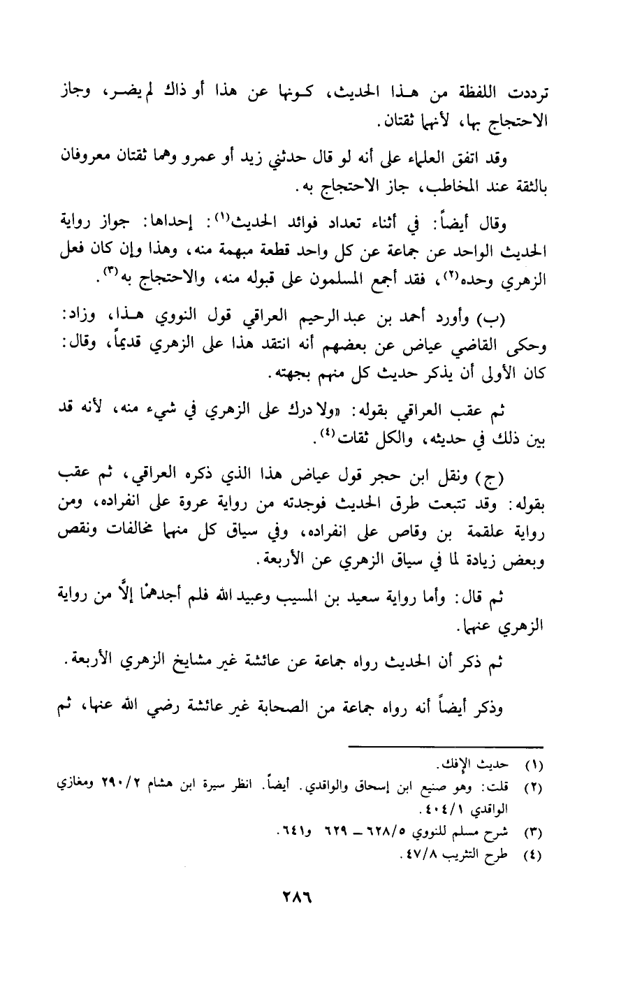 ج- ونقل ابن حجر قول عياض هذا الذي ذكره العراقي، ثم عقب بقوله: "وقد تتبعت طرق الحديث فوجدته من رواية عروة على انفراده، ومن رواية علقمة بن وقاص على انفراده، وفي سياق كل منهما مخالفات ونقص وبعض زيادة لما في سياق الزهري عن الأربعة".