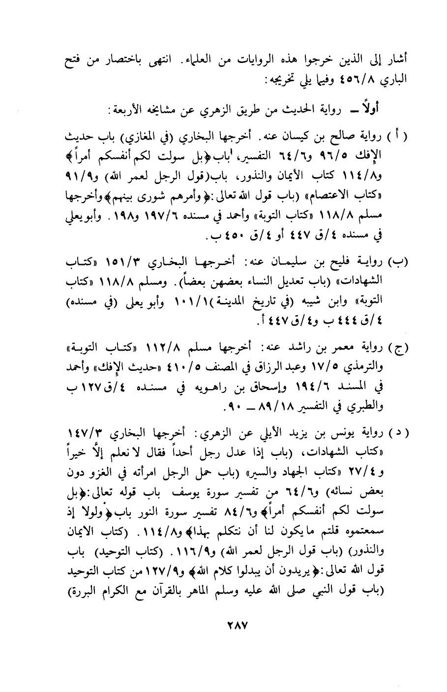 ج- رواية معمر بن راشد عنه: أخرجها مسلم 8/ 112 كتاب التوبة والترمذي5/17 وعبد الرزاق في المصنف 5/410 حديث الإفك وأحمد في المسند 6/194 وإسحاق بن راهويه في مسنده 4/ ق 127 ب والطبري في التفسير 18/ 89- 90.