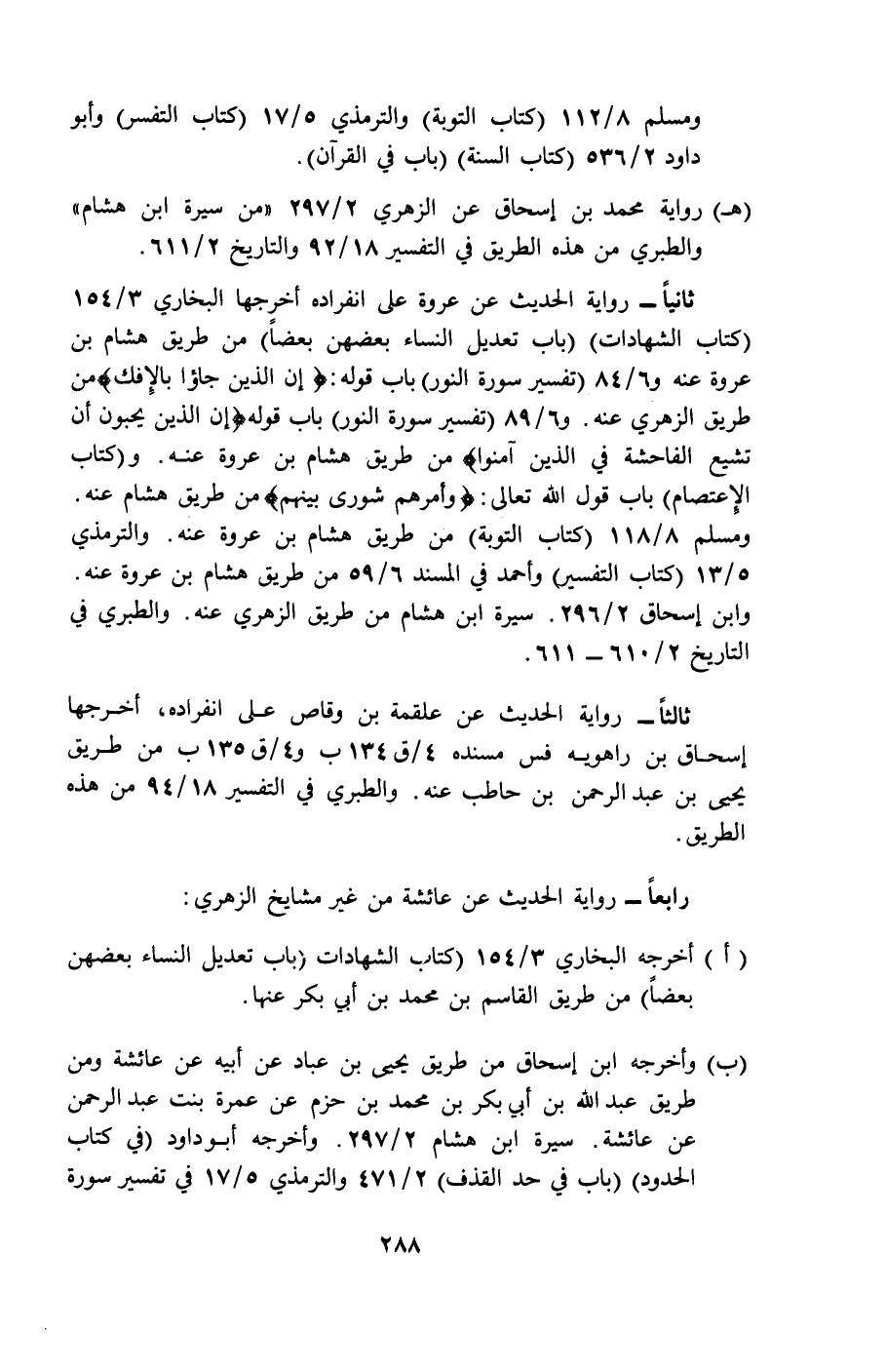 ب- وأخرجه ابن إسحاق من طريق يحيى بن عباد عن أبيه عن عائشة ومن طريق عبد الله بن أبي بكر بن محمد بن حزم عن عمرة بنت عبد الرحمن عن عائشة، سيرة ابن هشام 2/297. وأخرجه أبو داود في كتاب الحدود باب في حد القذف 2/471، والترمذي 5/17 في تفسير سورة