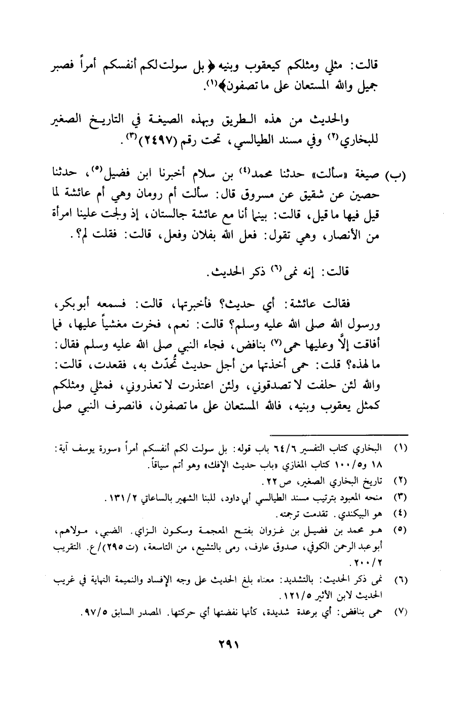 ب- صيغة (سألت) حدثنا محمد4 بن سلام أخبرنا ابن فضيل5، حدثنا حصين عن شقيق عن مسروق قال:" سألت أم رومان وهي أم عائشة لما قيل فيها ما قيل، قالت: "بينما أنا مع عائشة جالستان، إذ ولجت علينا امرأة من الأنصار، وهي تقول: فعل الله بفلان وفعل"، قالت: " فقلت: لم؟ " قالت: إنه نمى"6 ذكر الحديث.
