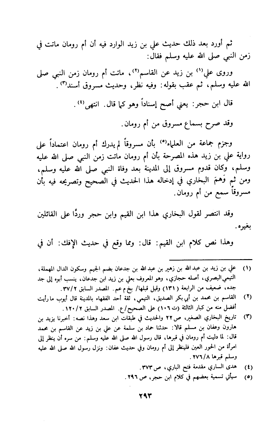 وجزم جماعة من العلماء5 بأن مسروقا لم يدرك أم رومان اعتمادا على رواية علي بن زيد هذه المصرحة بأن أم رومان ماتت زمن النبي صلى الله عليه وسلم، وكان قدوم مسروق إلى المدينة بعد وفاة النبي صلى الله عليه وسلم، ومن ثم وهم البخاري في إدخاله هذه الحديث في الصحيح وتصريحه فيه بأن مسروقا سمع من أم رومان.