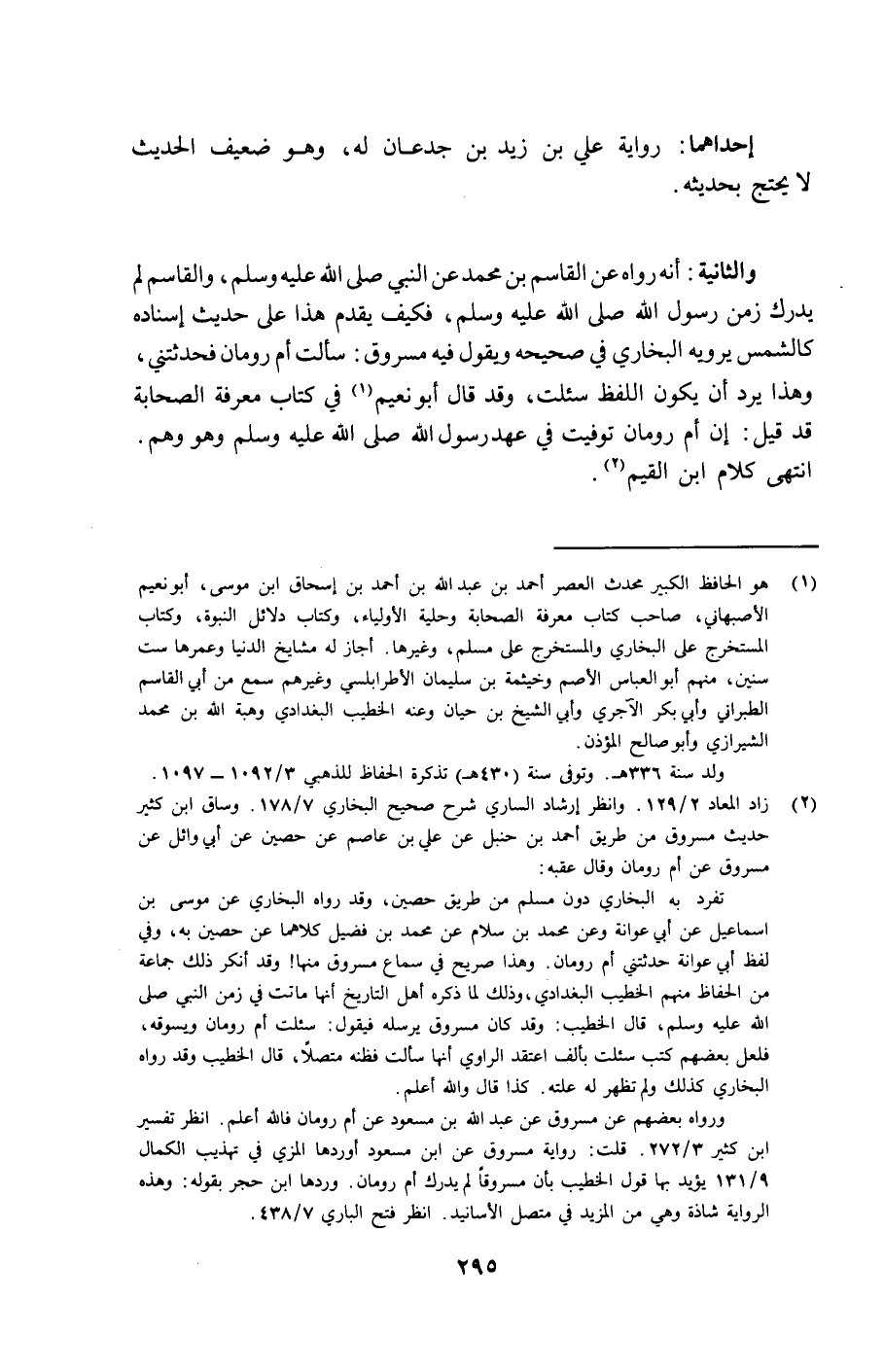 والثانية: أنه رواه عن القاسم بن محمد عن النبي صلى الله عليه وسلم، والقاسم لم يدرك زمن رسول الله صلى الله عليه وسلم، فكيف يقدم هذا على حديث إسناده كالشمس يرويه البخاري في صحيحه ويقول فيه مسروق: سالت أم رومان فحدثتني، وهذا يرد أن يكون اللفظ سئلت، وقد قال أبو نعيم1 في كتاب معرفة الصحابة قد قيل: إن أم رومان توفيت في عهد رسول الله صلى الله عليه وسلم وهو وهم". انتهى كلام ابن القيم2.