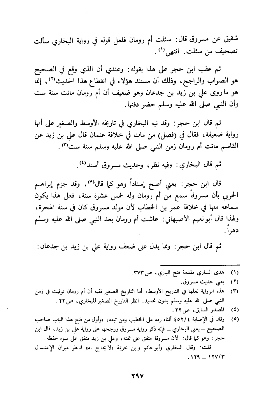 3 هذه الرواية لعلها في التاريخ الأوسط، أما في التاريخ الصغير ففيه أن أم رومان توفيت في زمن النبي صلى الله عليه وسلم بدون تحديد. انظر التاريخ الصغير للبخاري، ص 22.