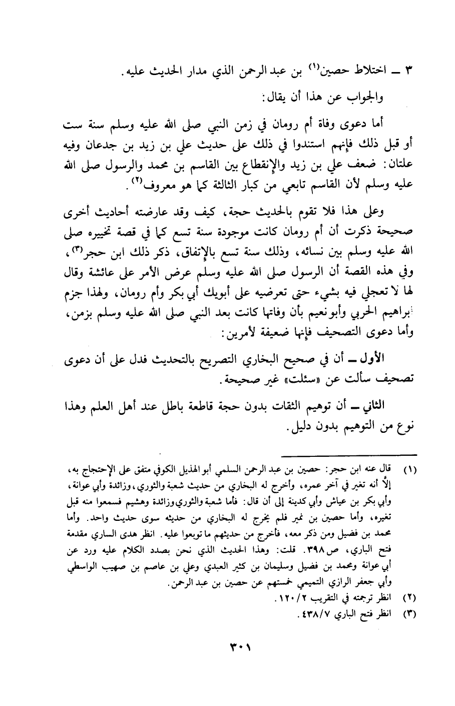 أما دعوى وفاة أم رومان في زمن النبي صلى الله عليه وسلم سنة ست أو قبل ذلك فإنهم استندوا في ذلك على حديث علي بن زيد بن جدعان وفيه علتان: ضعف علي بن زيد والانقطاع بين القاسم بن محمد والرسول صلى الله عليه وسلم لأن القاسم تابعي من كبار الثالثة كما هو معروف2.