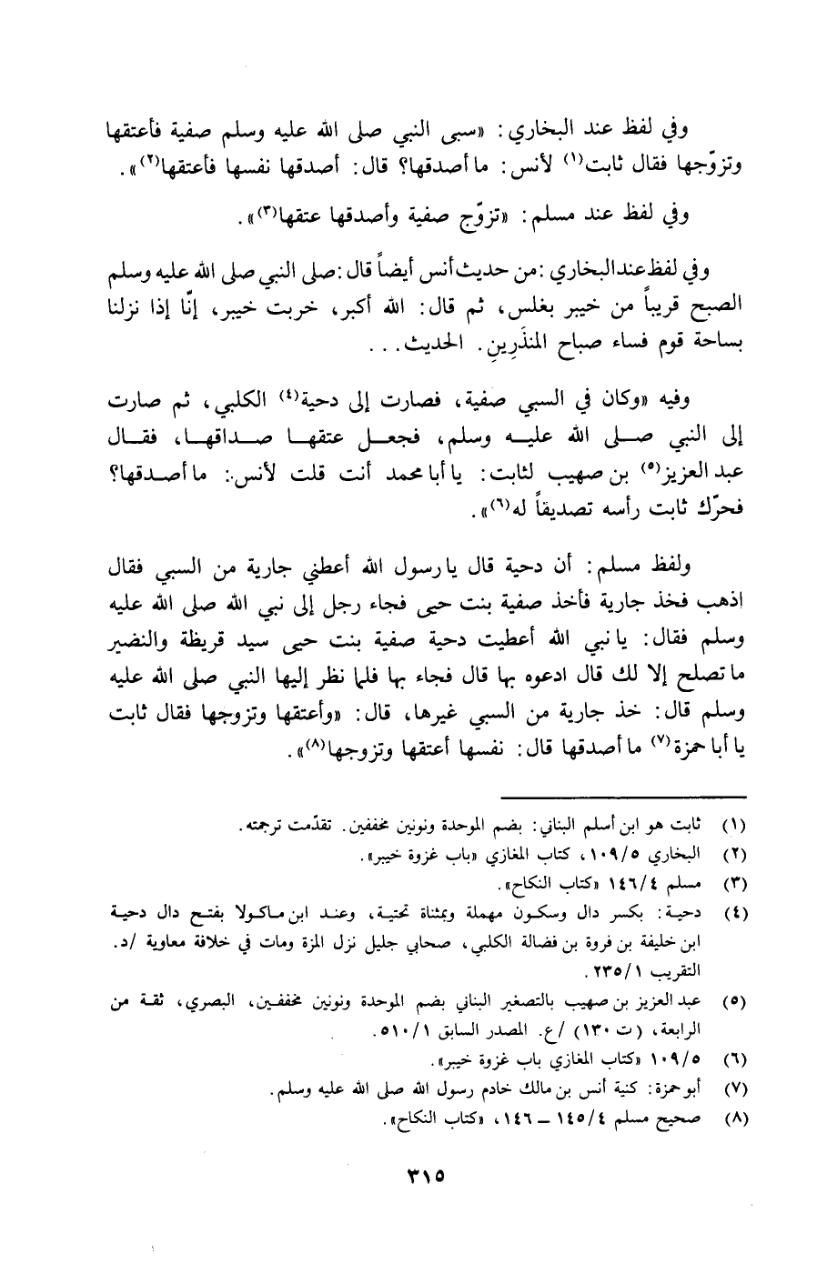 وفيه: "وكان في السبي صفية، فصارت إلى دحية4 الكلبي، ثم صارت إلى النبي صلى الله عليه وسلم، فجعل عتقها صداقها، فقال عبد العزيز5 بن صهيب لثابت: يا أبا محمد أنت قلت لأنس: ما أصدقها؟ فحرك ثابت رأسه تصديقا له"6.