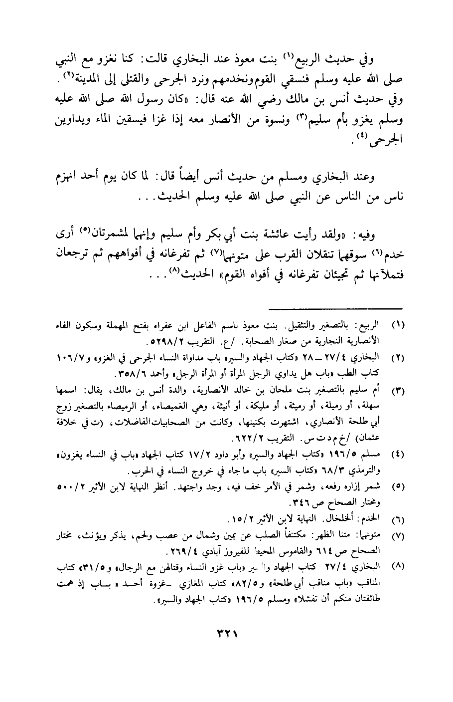4 مسلم5/196 كتاب الجهاد والسير، وأبو داود2/17 كتاب الجهاد باب في النساء يغزون والترمذي 3/68 كتاب السير باب ما جاء في خروج النساء في الحرب.