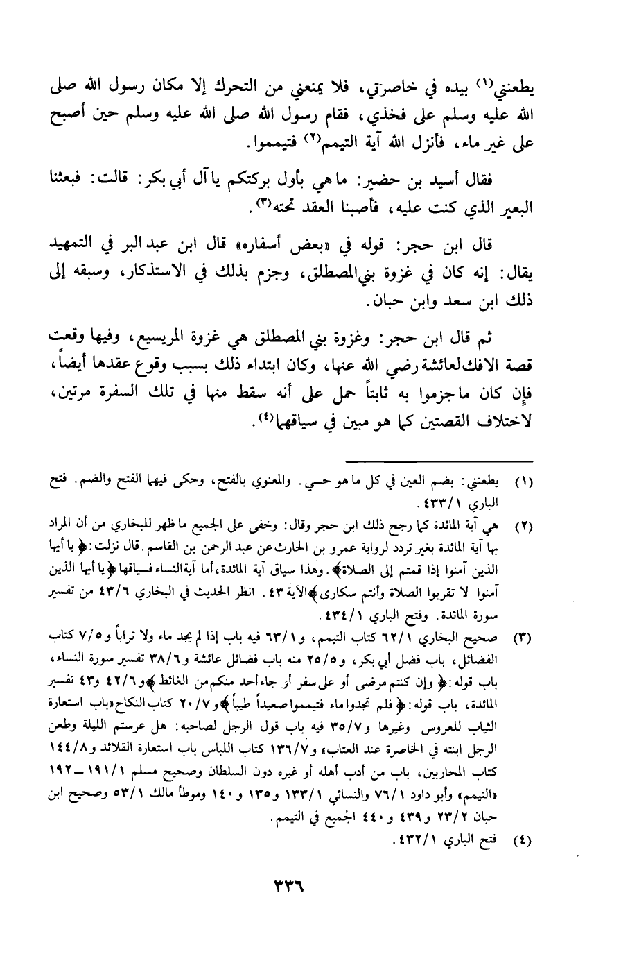 3 صحيح البخاري1/62 كتاب التيمم، و1/63 فيه، باب إذا لم يجد ماء ولا ترابا و5/7 كتاب الفضائل، باب فضل أبي بكر، و5/25 منه، باب فضائل عائشة و6/38 تفسير سورة النساء، باب قوله: {وَإِنْ كُنْتُمْ مَرْضَى أَوْ عَلَى سَفَرٍ أَوْ جَاءَ أَحَدٌ مِنْكُمْ مِنَ الْغَائِطِ} و6/42 و43 تفسير المائدة، باب قوله: {فَلَمْ تَجِدُوا مَاءً فَتَيَمَّمُوا صَعِيداً طَيِّباً} و7/20 كتاب النكاح باب استعارة الثياب للعروس وغيرها و7/35 فيه باب قول الرجل لصاحبه: هل عرستم الليلة وطعن الرجل ابنته في الخاصرة عند العتاب و7/136 كتاب اللباس باب استعارة القلائد و8/144 كتاب المحاربين، باب من أدب أهله أو غيره دون السلطان وصحيح مسلم 1/191- 192 (التيمم) وأبو داود 1/76 والنسائي 1/133 و135 و140 وموطأ مالك1/53 وصحيح ابن حبان2/23 و439 و440 الجميع في التيمم.