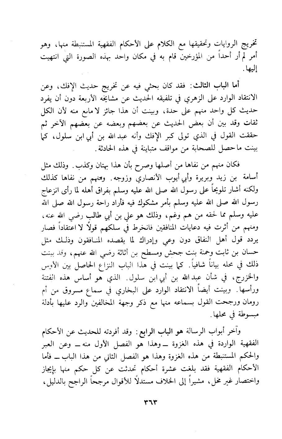 أما الباب الثالث: فقد كان بحثي فيه عن تخريج حديث الإفك، وعن الانتقاد الوارد على الزهري، في تلفيقه الحديث عن مشايخه الأربعة دون أن يفرد حديث كل واحد منهم على حدة، وبينت أن هذا جائز لا مانع منه لأن الكل ثقات وقد بين أن بعض الحديث عن بعضهم وبعضه عن بعضهم الآخر ثم حققت القول في الذي تولى كبر الإفك وأنه عبد الله بن أبي ابن سلول، كما بينت ما حصل للصحابة من مواقف متباينة في هذه الحادثة.